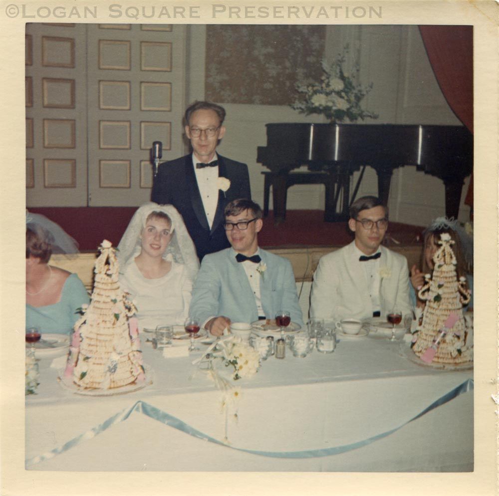 Photo of bride and groom sitting at head table with kransekake (wreath cakes) at Norma Altern - Samuel Smith wedding reception in banquet hall at Norske Klub, 1968Photograph Details