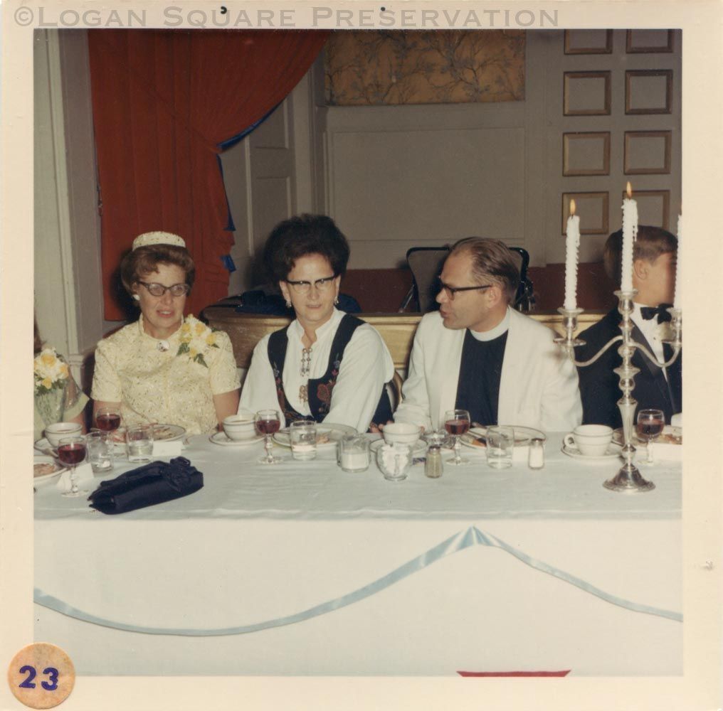 Photo of head wedding table with mother of bride Ruth Altern sitting with Minnekirken pastor Vik and wife in banquet hall at Norske Klub, 1968Photograph Details