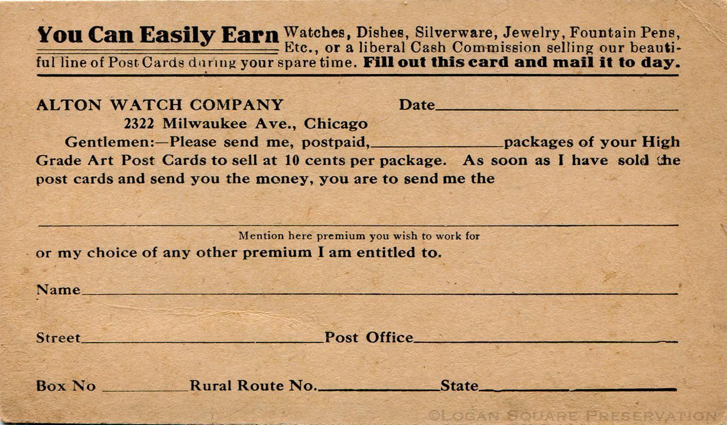 Private mailing card with reply form on back for placing wholesale order of postcards and sales premiums from Alton Watch Company, circa 1910sSubject Person/Organization
