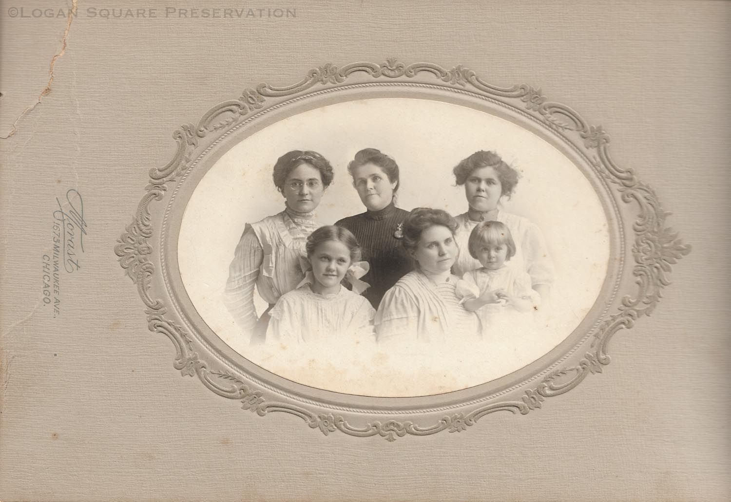 Studio portrait in cardboard frame of woman in black surrounded by women and girls wearing white dresses taken at Morast Photo Studio, 1909Photograph Details