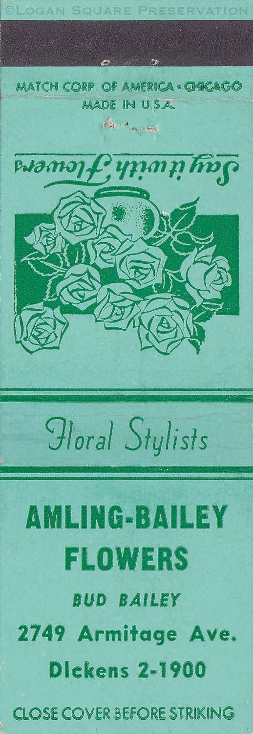 1.5" matchbook cover printed in green ink on teal for Amling-Bailey florists, circa 1940sPublication Details
