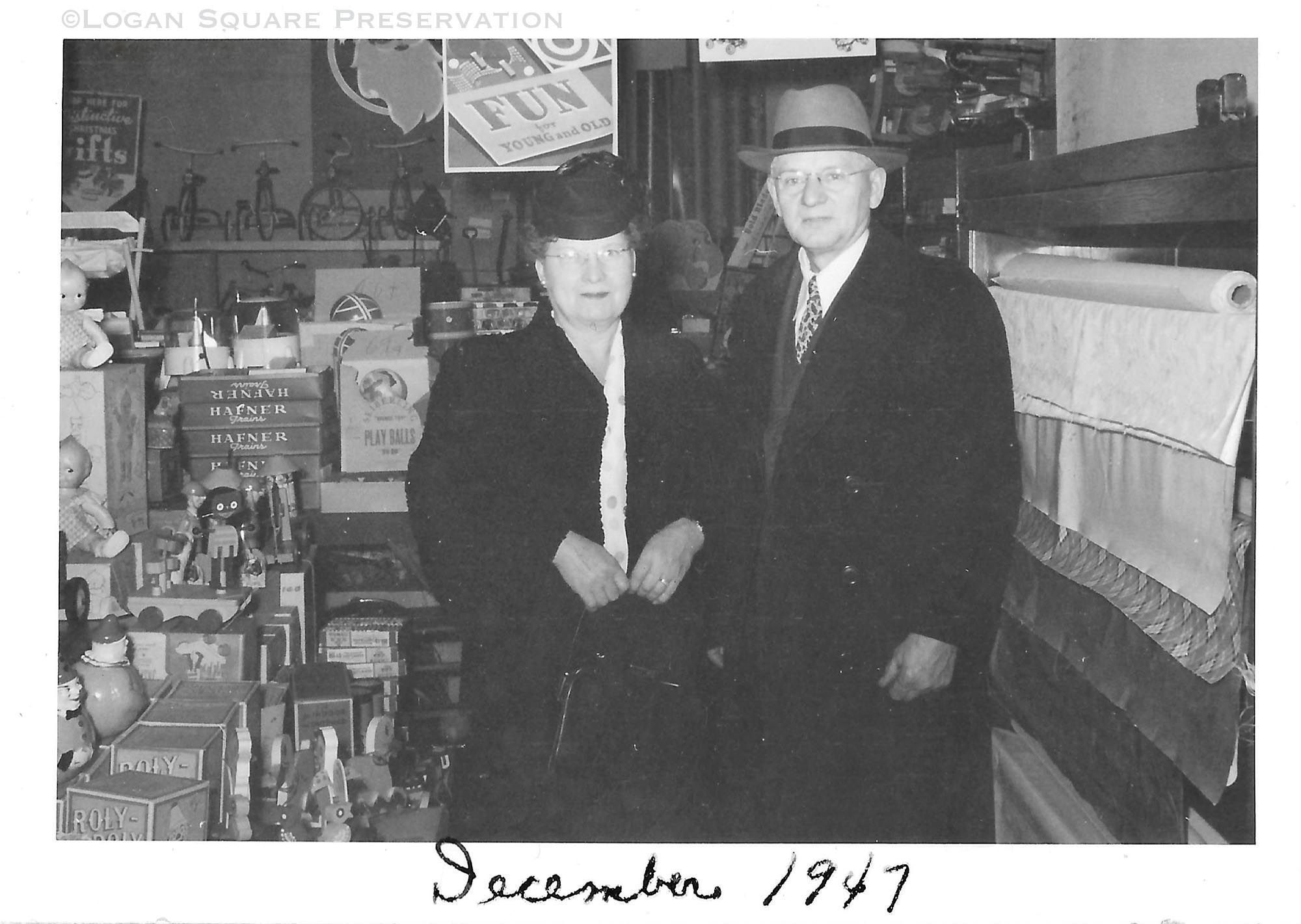 Snapshot photo of Logan Hardware owners Anton & Kate Kosiba amongst toys and fabric for sale in aisles of hardware store, Dec 1947Photograph Details