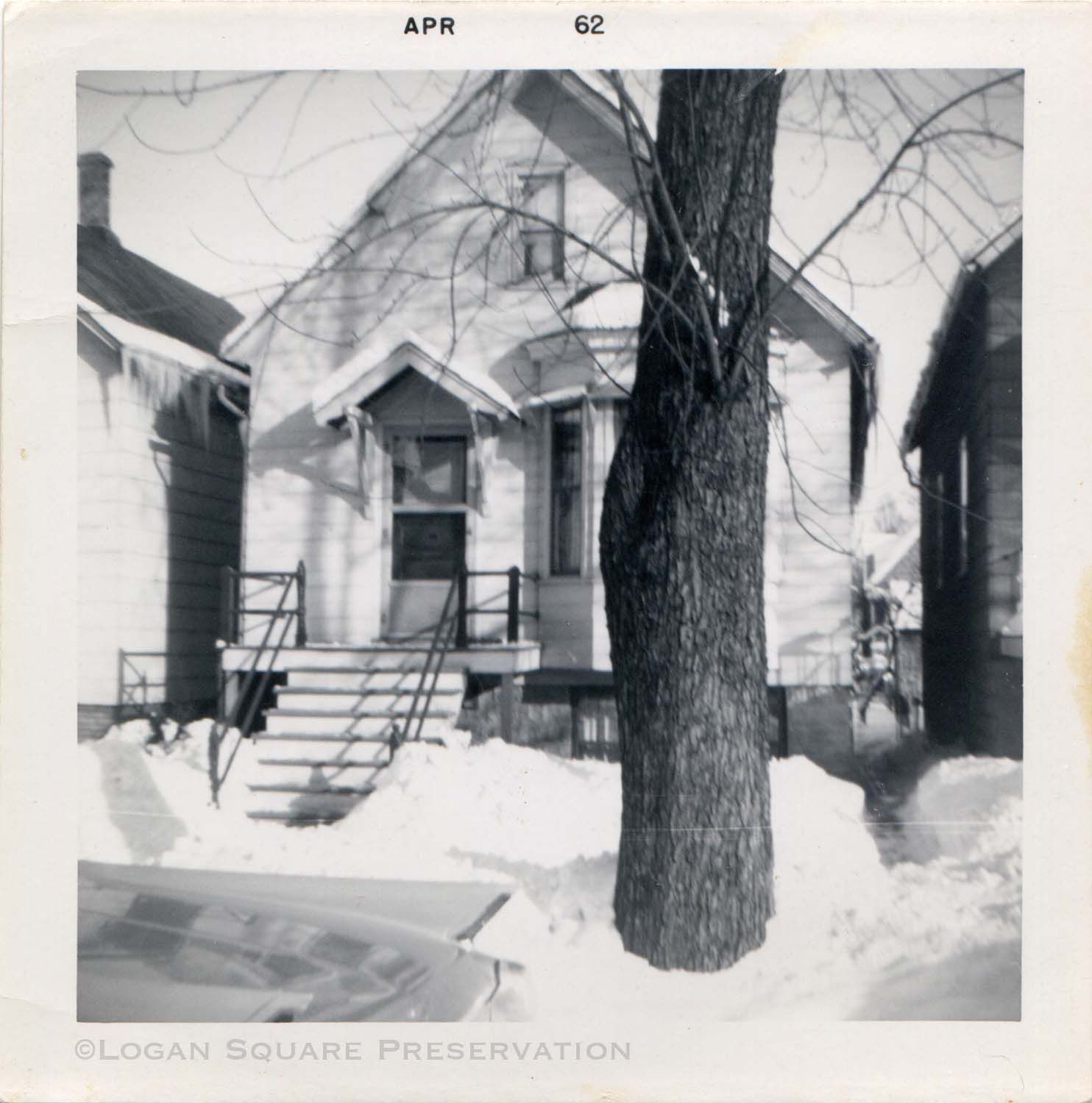 Snapshot photo of cottage at 2451 N. Richmond on snowy day in winter Jan or Feb 1962, photo printed April 1962Photograph Details
