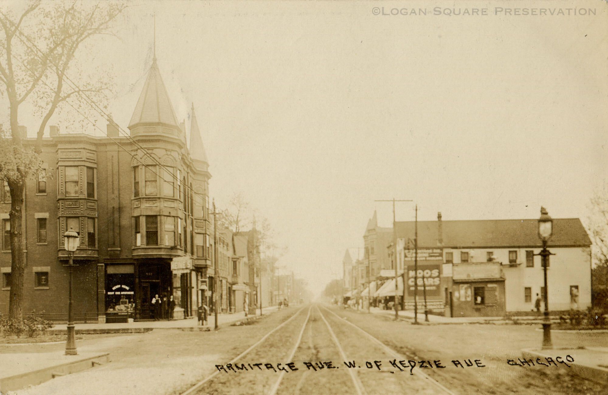 Real-photo postcard view looking west down streetcar tracks from Kedzie Ave intersection, circa 1910. Real estate shack at northwest corner and painted advertisement for Moos Cigars on wall of 3208 W. Armitage behind.Subject