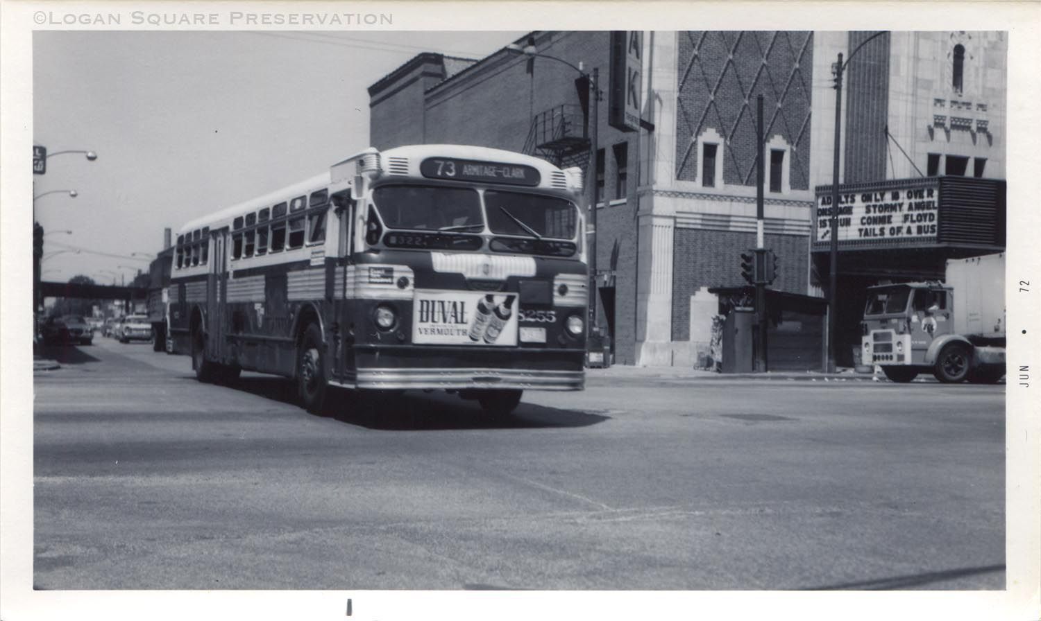 Photograph of eastbound Armitage Ave bus #8255 crossing Western Ave with Oak Theatre adult movie theater marquee and sidewalk news stand in background, printed June 1972Photograph Details
