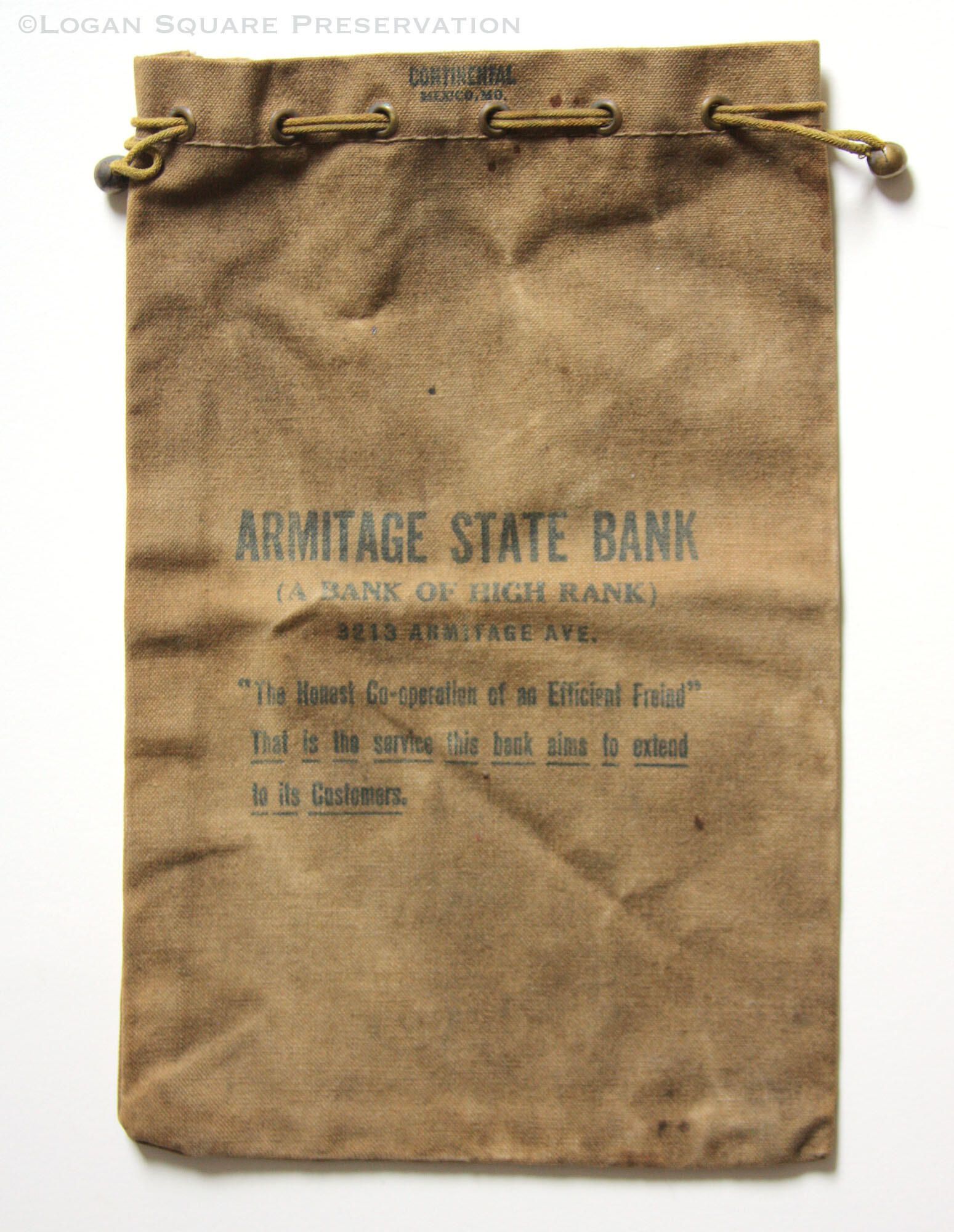 Drawstring canvas bag with printed advertisement for Armitage State Bank (A Bank of High Rank), circa 1925-1930Made/Created