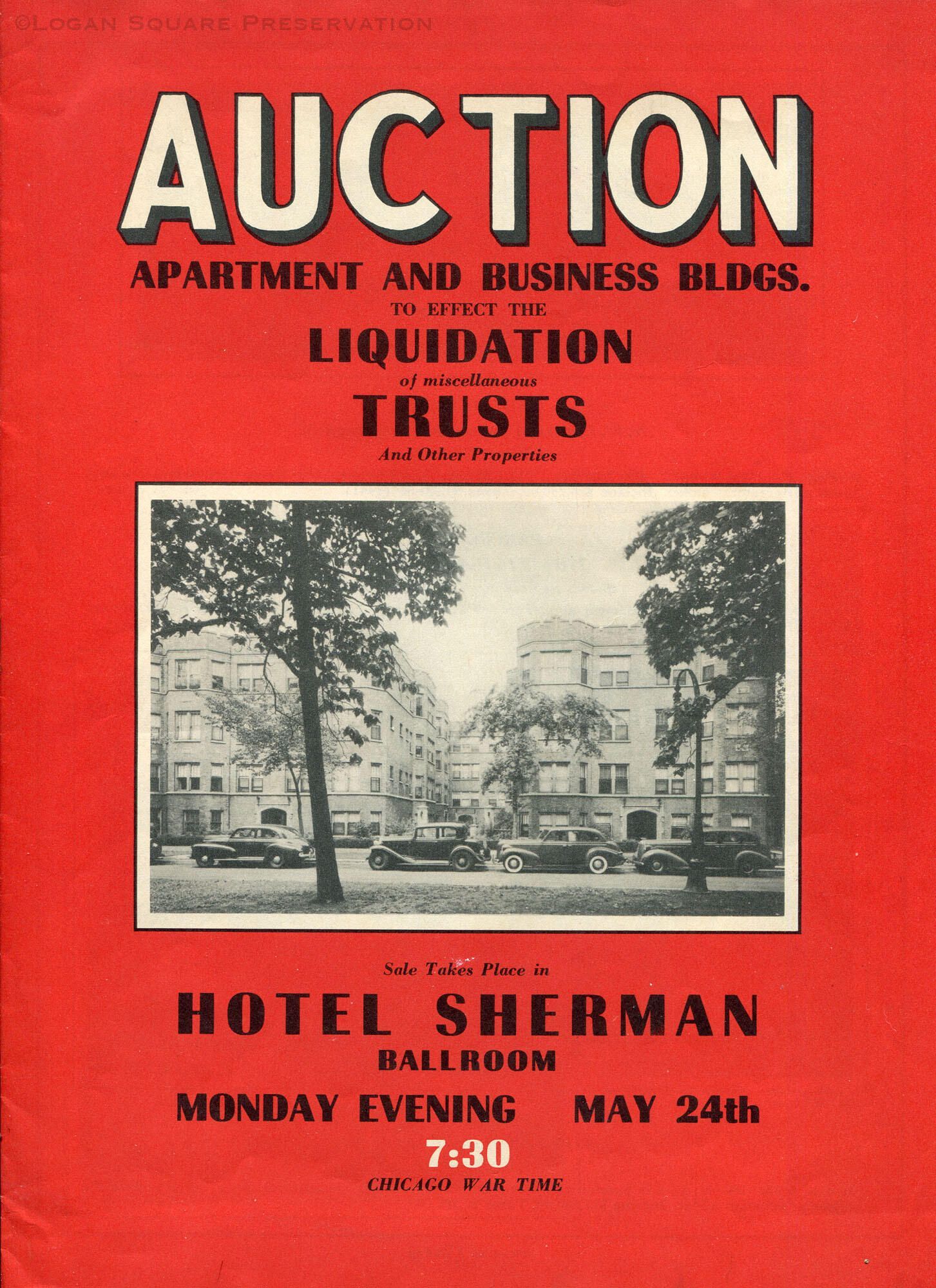 16-pg stapled booklet listing properties for real estate auction at Hotel Sherman ballroom, May 24, 1943. Contains photos of apartment buildings up for auction, including 1704-1716 N. Humboldt Blvd on cover.Publication Details