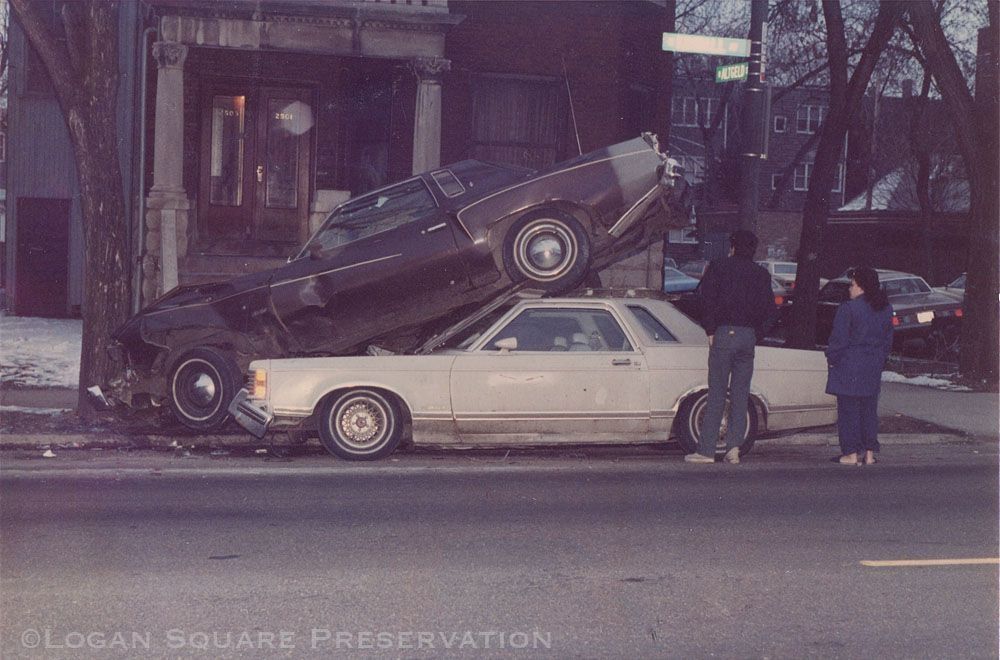 Snapshot photo at dusk of two bystanders looking at damaged car on top of another in parking lane of northbound Kimball Ave, dated on back March 2, circa 1980sPhotograph Details