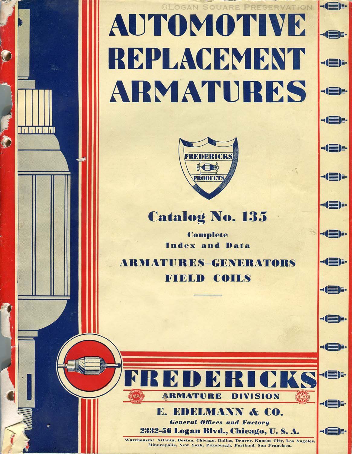 84-pg catalog listing electric generators made by Fredericks Armature Division of E. Edelmann & Co for various automobile makes, with photos of factory on inside cover, 1934Publication Details