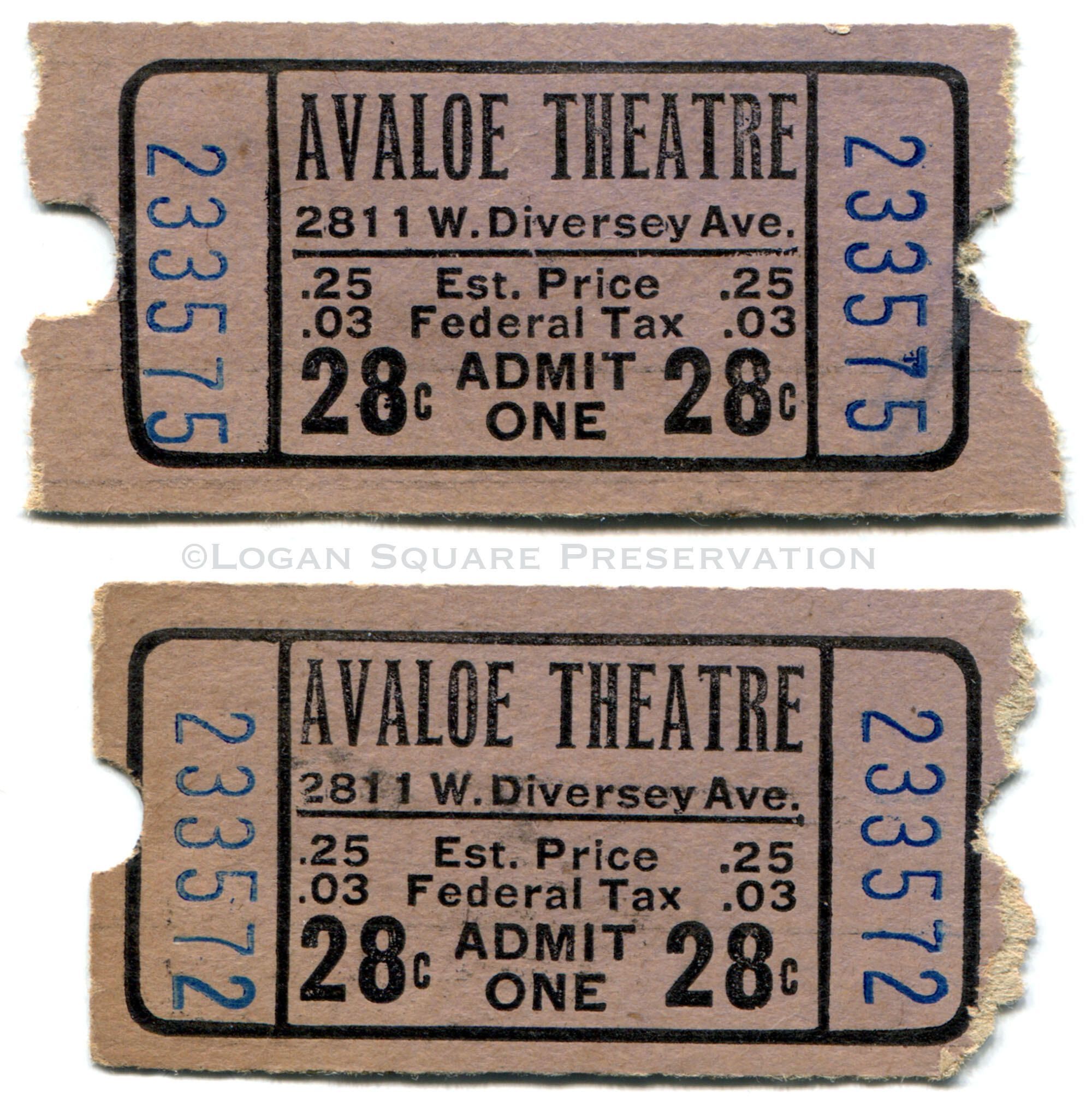 Two 28¢ movie theater ticket stubs from Avaloe Theater, circa 1930sPublication Details