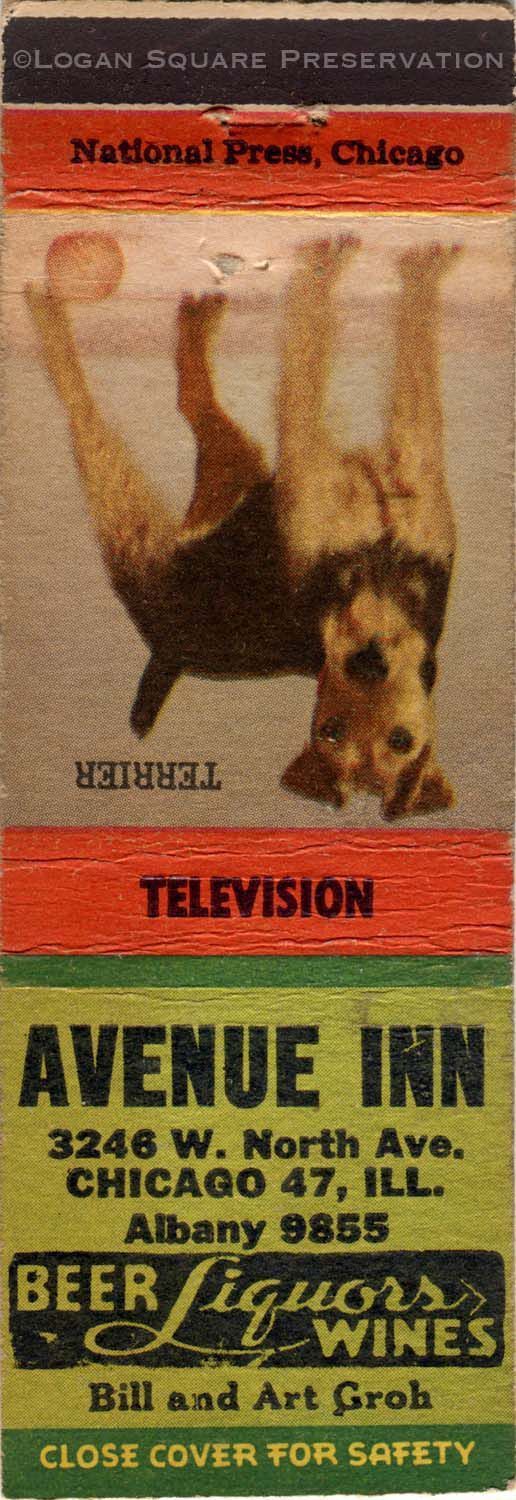 1.5" matchbook with photograph of terrier dog breed on back for Avenue Inn tavern, circa 1940sPublication Details