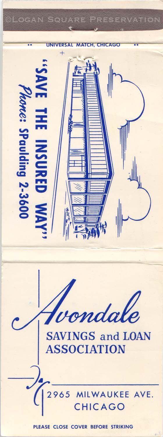 2" matchbook printed in blue ink on cream paper with illustration of modern Avondale Savings bank on back, circa 1960-1963Publication Details
