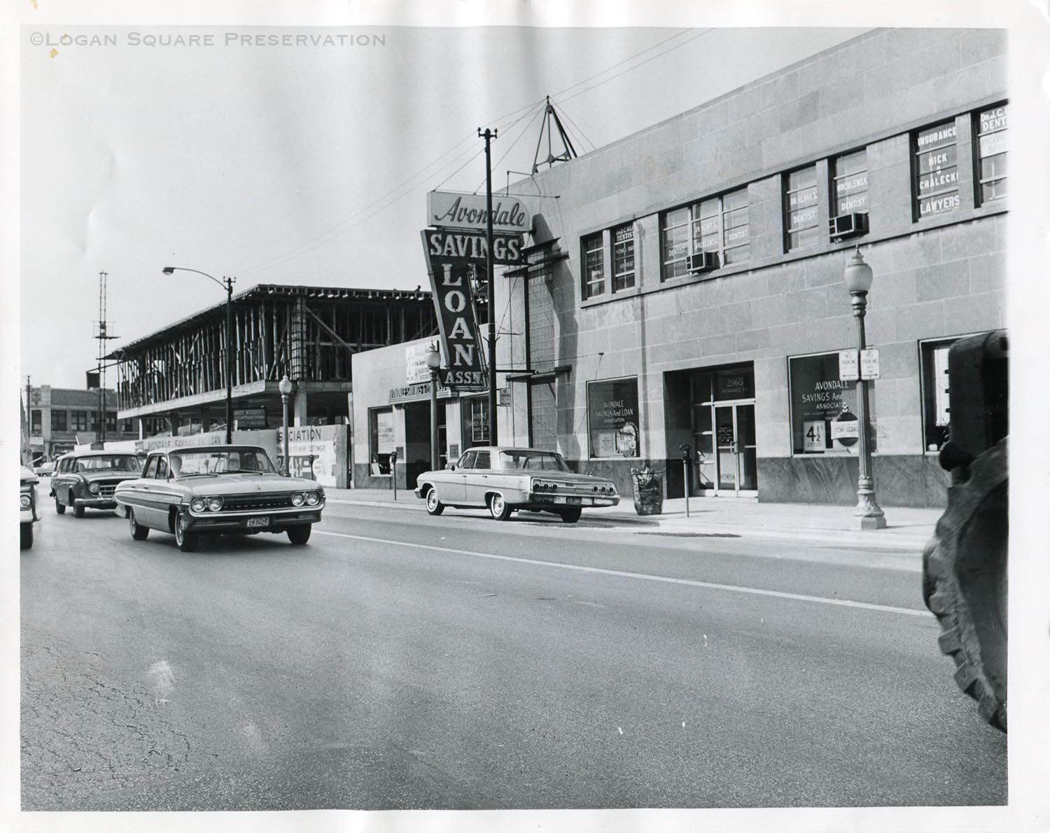 News photo looking north at Milwaukee Avenue traffic, neon sign on old Art Moderne-style Avondale Savings & Loan building built 1948 and new modernist Avondale Savings & Loan bank building under construction, 1964Photograph Details