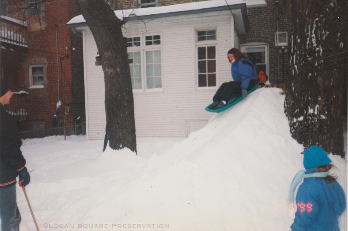 Snapshot photo of children sledding on tall pile of snow in backyard of 2304 N. Sawyer Ave after January 2 blizzard, 1999Photograph Details