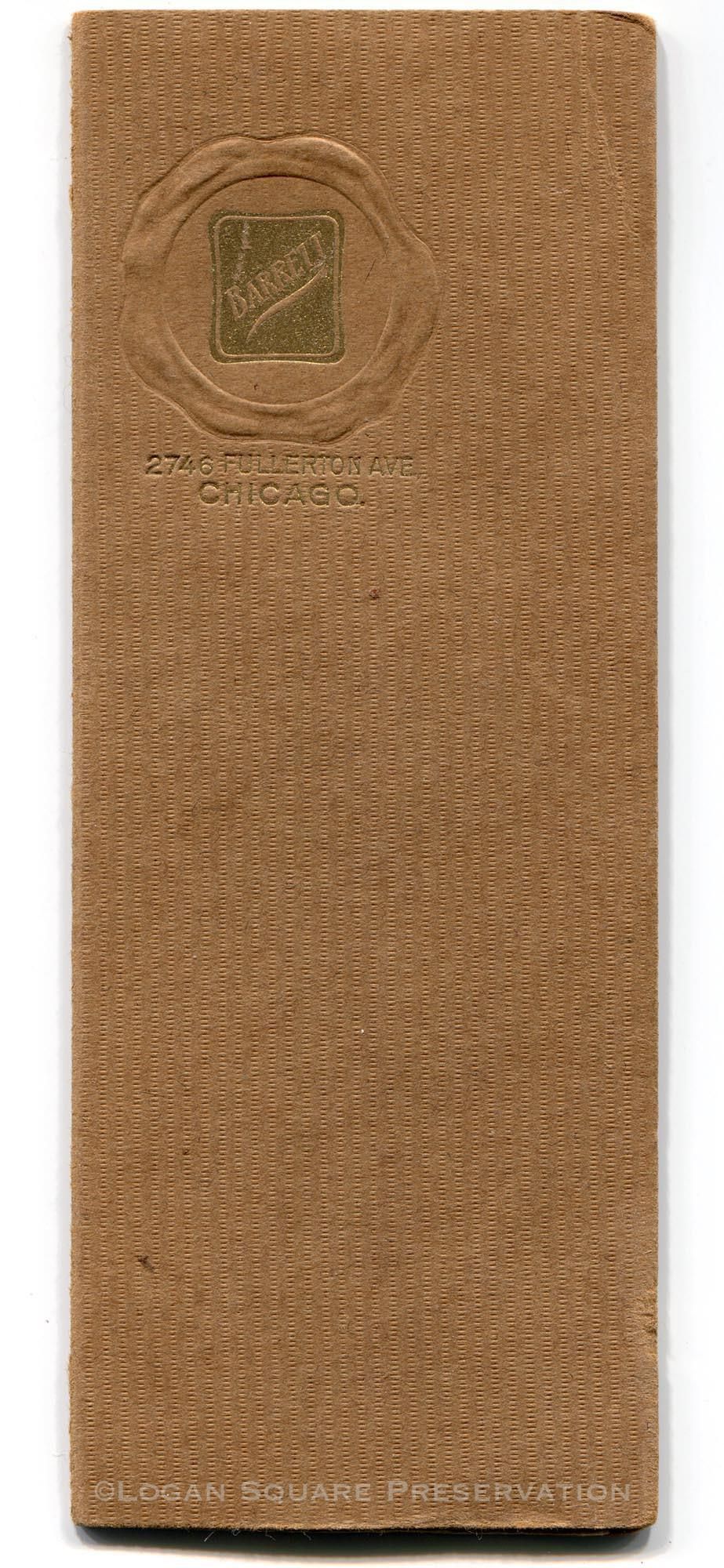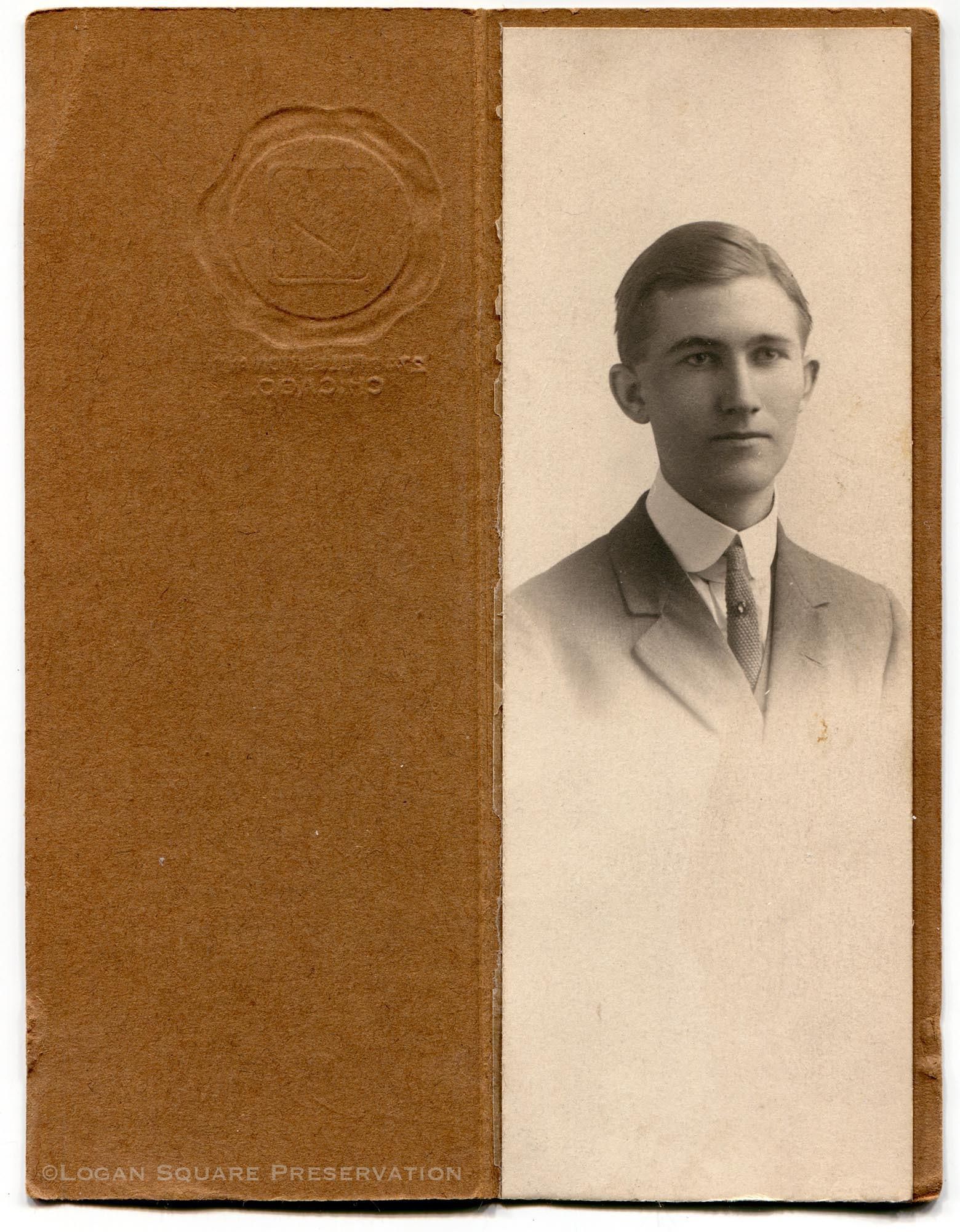 Studio portrait of unidentified man in cardstock folder with embossed seal and logo of Barrett photography studio on cover, circa 1915-1921Photograph Details