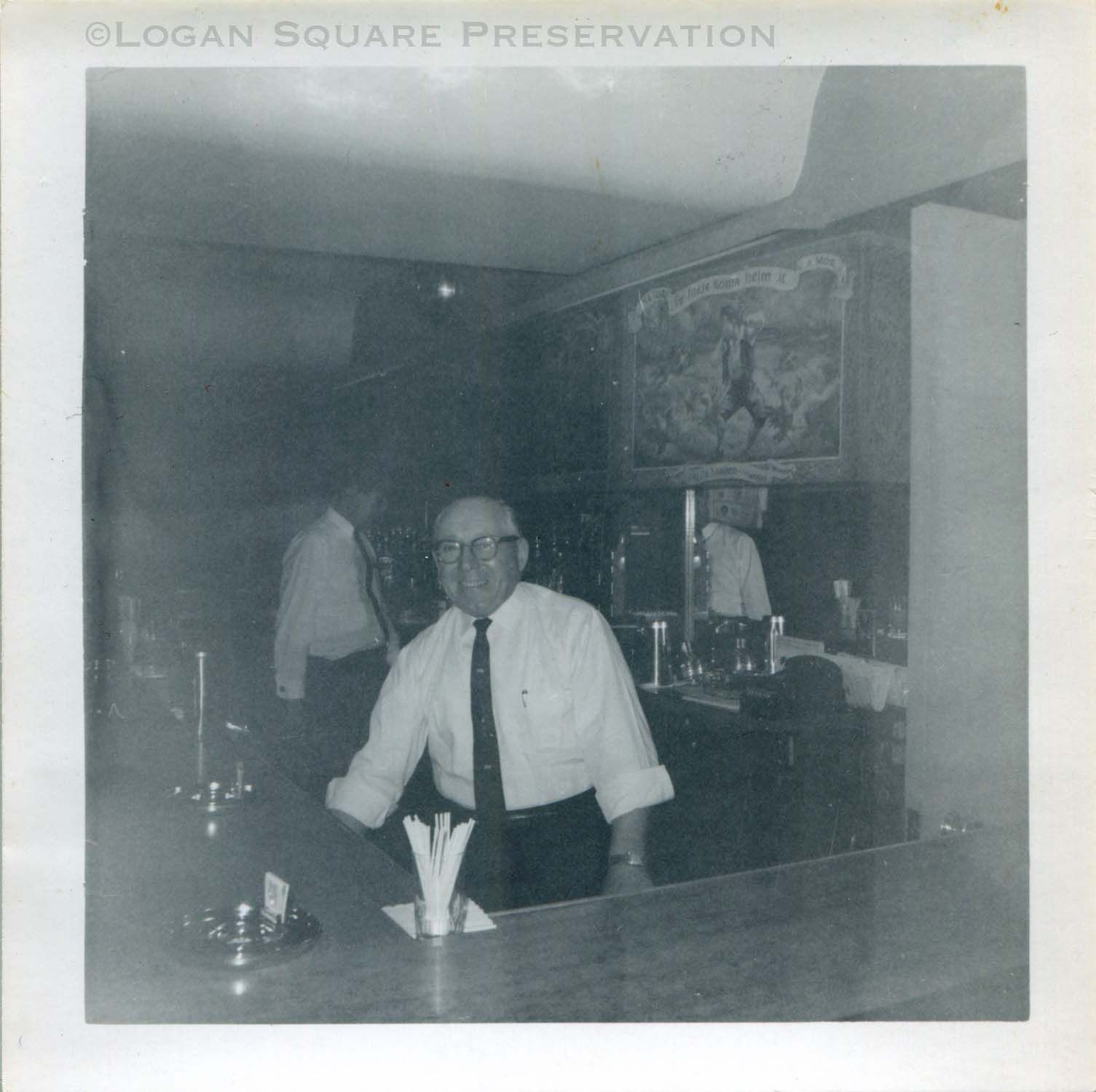 Snapshot photograph of man behind bar with painted cabinets behind at Normennenes Club House, circa March 1962Photograph Details