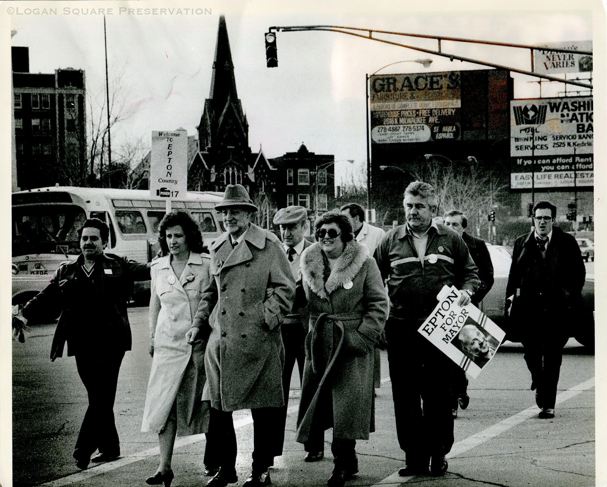 News photo of Republican mayoral nominee Bernard Epton and supporters crossing street near Milwaukee Avenue at Logan Square. Minnekirken and billboards on Grace furniture store in background, 1983.Photograph Details