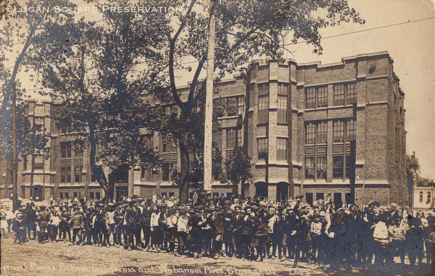 Real-photo postcard view of crowd of children gathered along California Ave in front of school building, circa 1908-1910. C.R. Childs postcard #2607. Moos school designed by Chicago Board of Education head architect Dwight H. Perkins and built in 1907.Subject Person/Organization