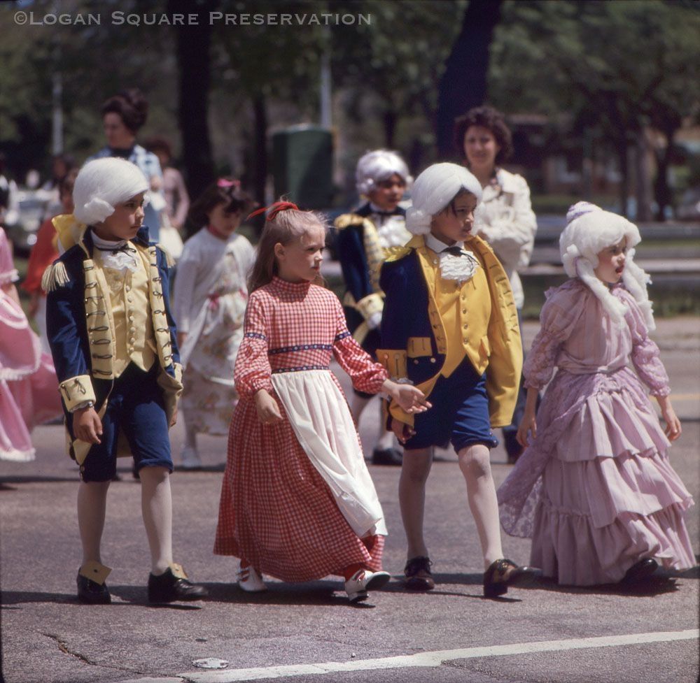 35mm color slide transparency photo of children dressed in colonial-style costume dresses, waistcoats, breeches, coats and wigs walking on Logan Boulevard toward outdoor Bicentennial mass at Logan Square Monument, May 22, 1976Photograph Details