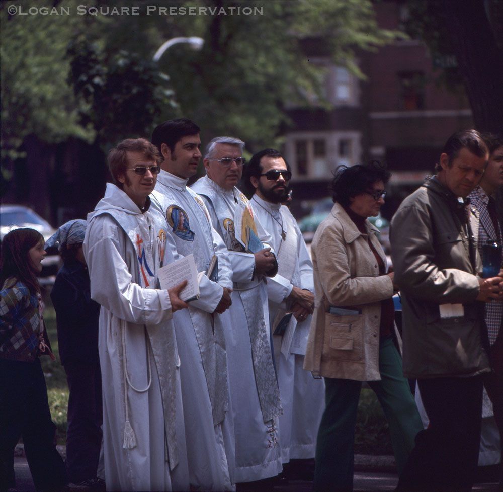 35mm color slide transparency photo of four Catholic priests in white robes with embroidered stoles walking with parishioners west on Logan Boulevard toward outdoor Bicentennial mass at Logan Square Monument, May 22, 1976Photograph Details