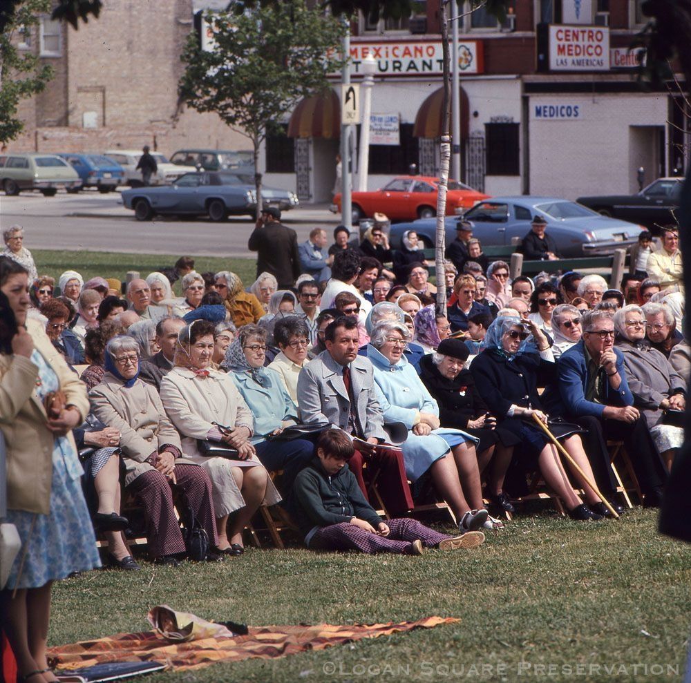 35mm color transparency slide of worshipers sitting on folding chairs watching outdoor Bicentennial mass organized by twelve West Side Catholic churches, May 22, 1976Photograph Details