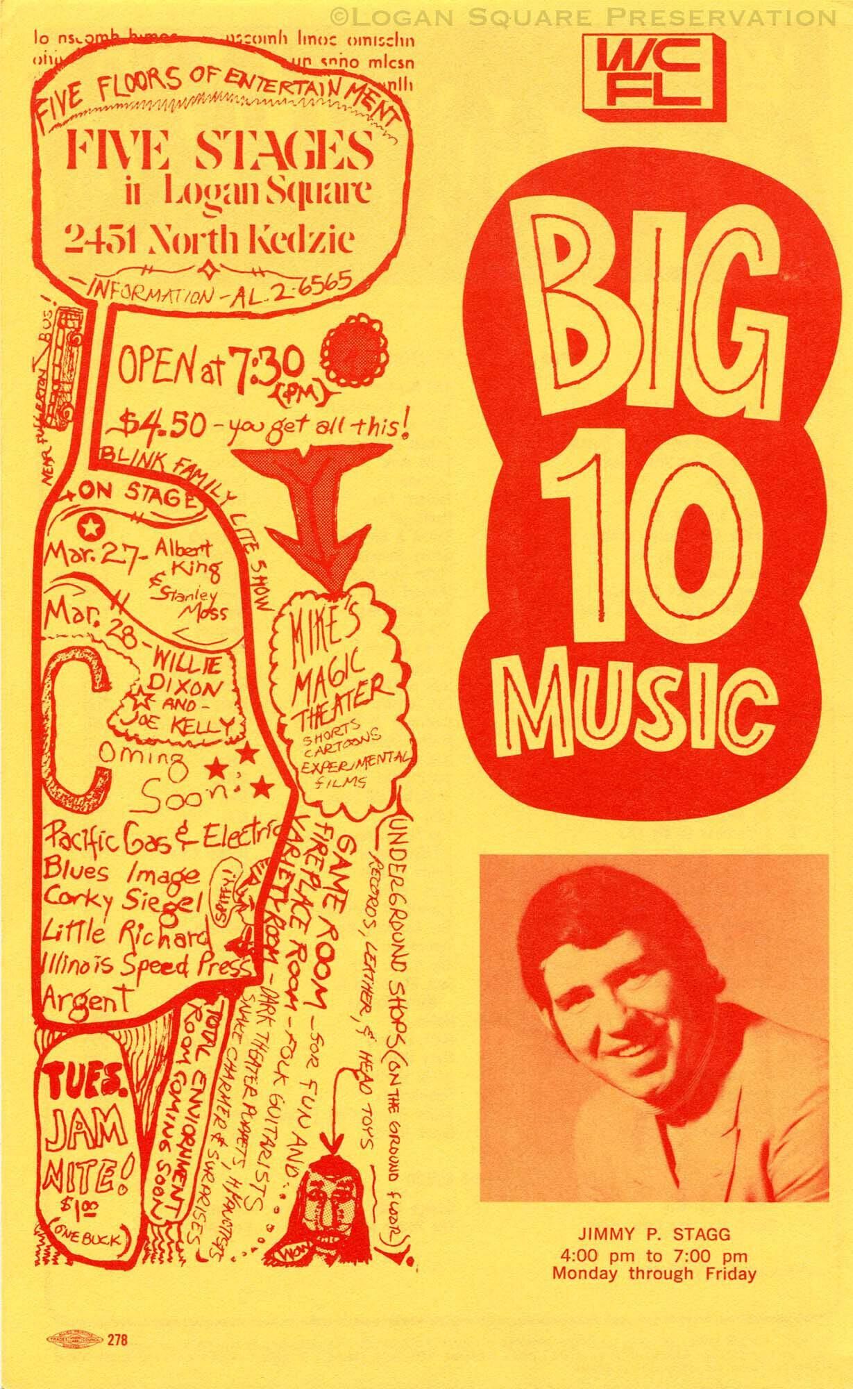 Promotional flyer printed in red ink on yellow paper for music, film and vendors on five floors and five stages, featuring Albert King, Willie Dixon and others at Logan Square Masonic Temple, sponsored by radio station WCFL. Inset photo of afternoon drive DJ Jimmy P. Stagg. Back of flyer lists "Big 10 Countdown" of 40 top charting pop and rock songs of March 23, 1970.Publication Details