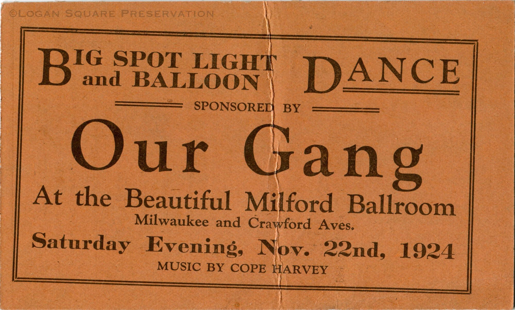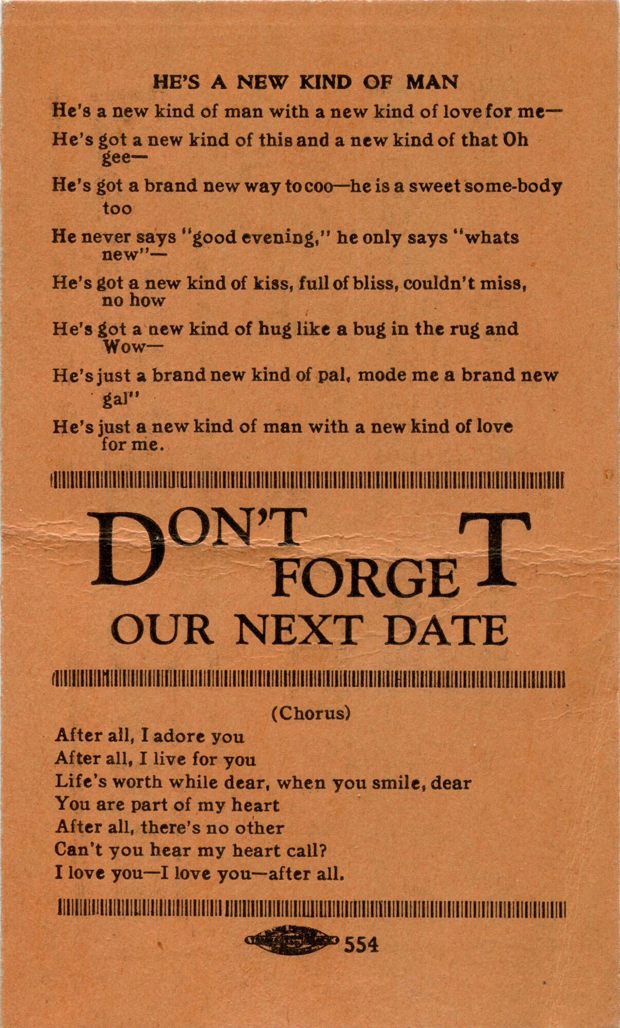 Invitation card to Nov 22, 1924 dance at Milford Ballroom sponsored by Our Gang, with music by Cope Harvey. Lyrics for "He's A New Kind of Man" on back.Publication Details