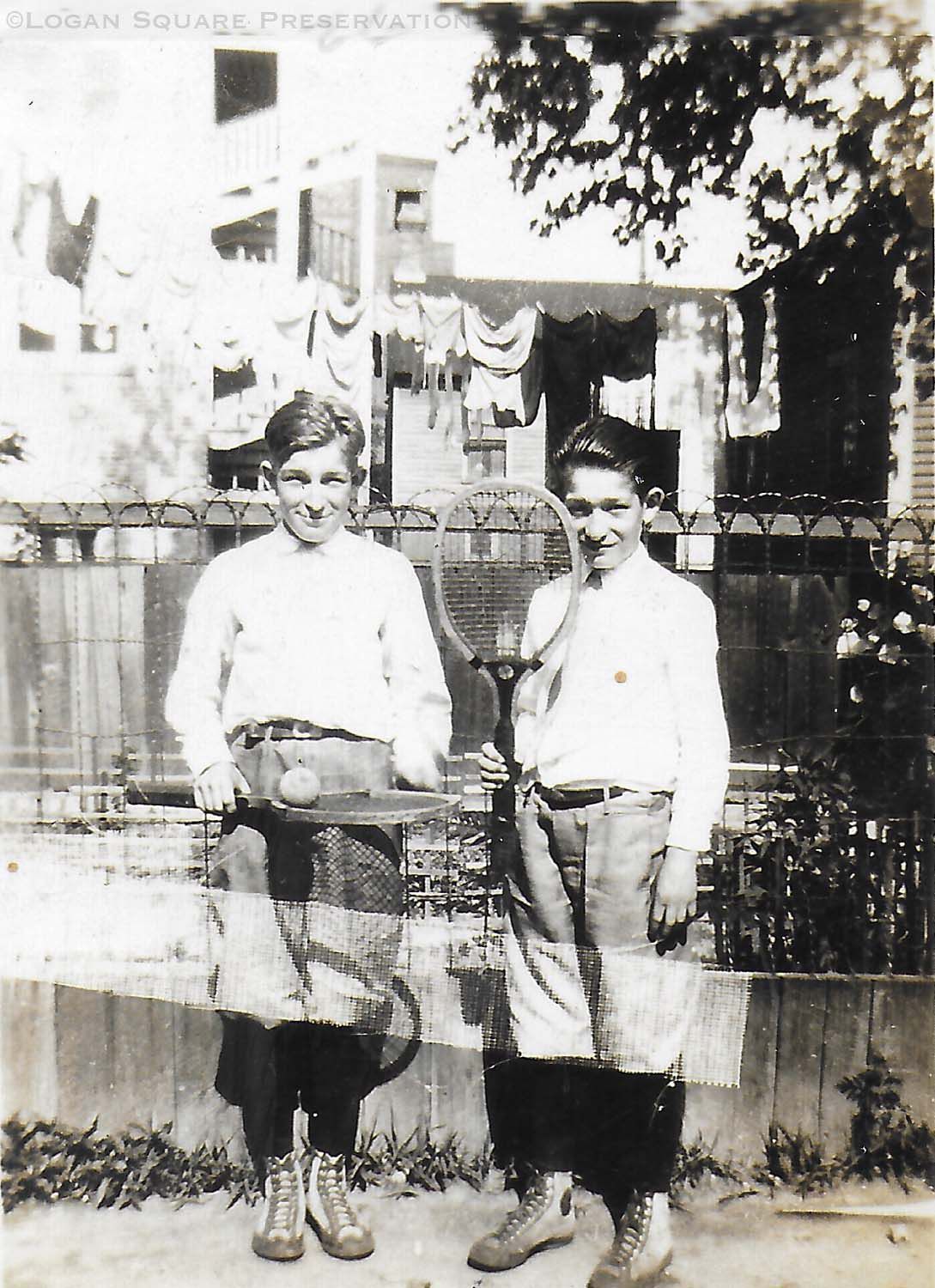 Snapshot photo of Bill and Stanley Jarek with tennis rackets next to fence between backyards and hanging laundry east of 2347 W McLean Ave (formerly Carver St), circa 1925-1926Photograph Details