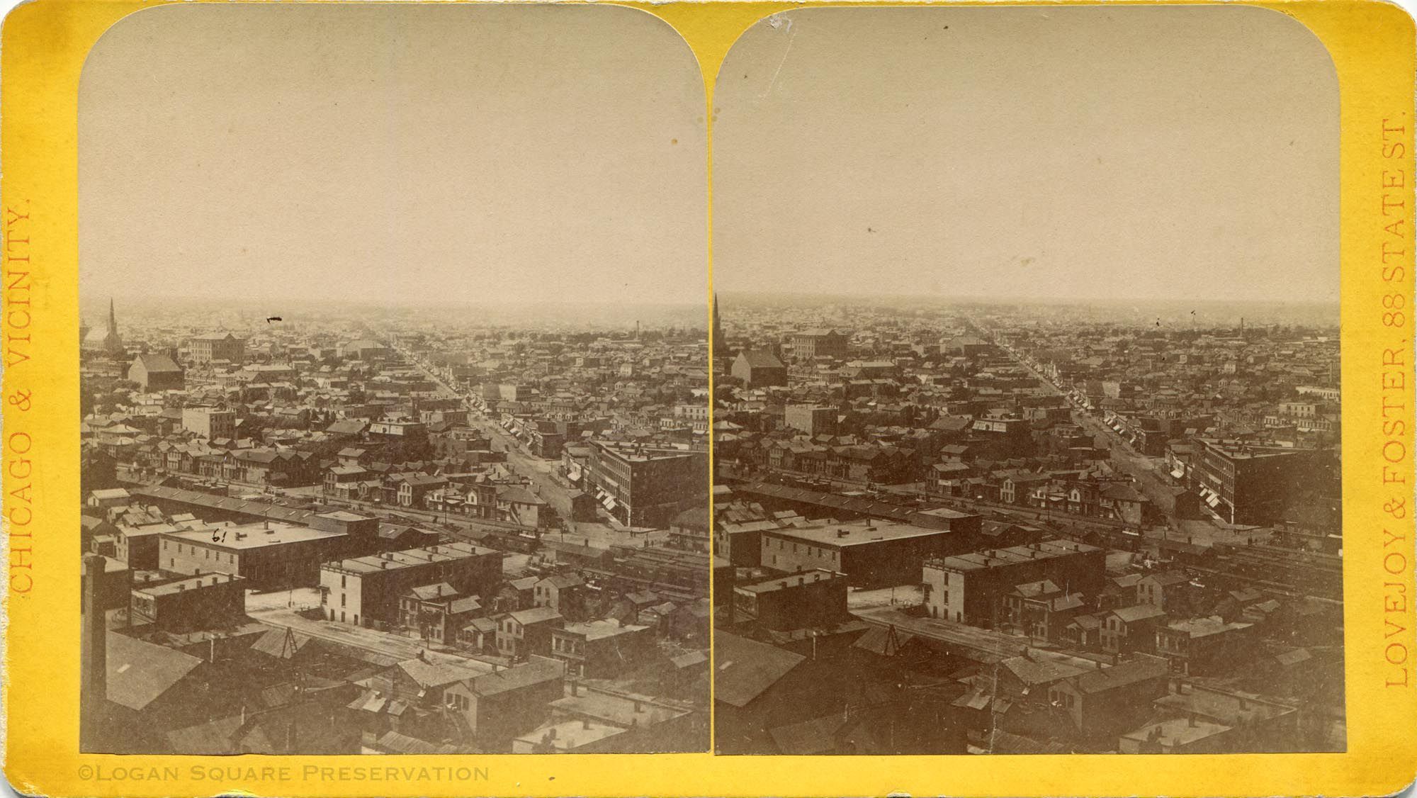 Stereosopic aerial photo view looking northwest up Milwaukee Avenue from junction at Kinzie St north of Chicago & Northwestern Railroad tracks, with tollbooth in center of street. Stereoview card #61 in Chicago & Vicinity series circa 1875.Photograph Details