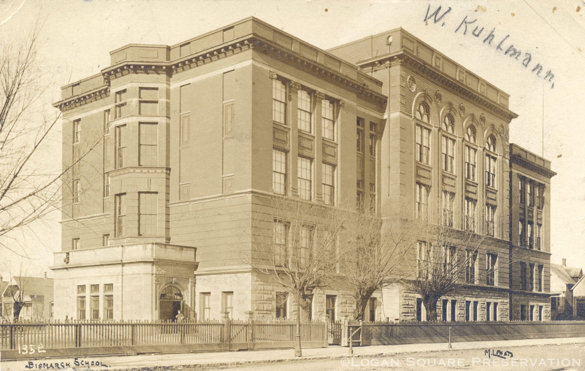 Real-photo postcard view looking northwest at Central Park facade of Bismarck School (now Funston Elementary), circa 1909Subject