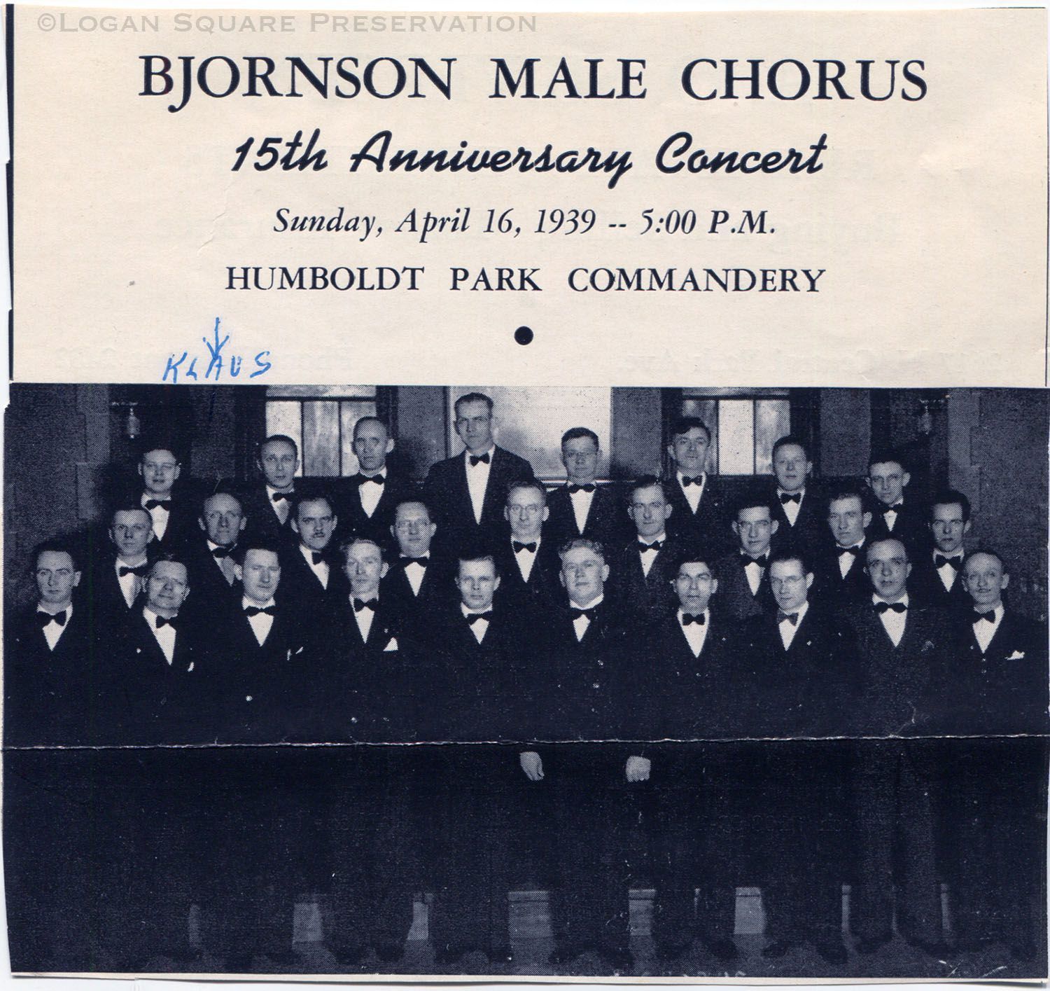 Clipped cover of concert program with photo of members of Bjornson Male Chorus and added note pointing to Klaus Tangeros, April 16, 1939Collection