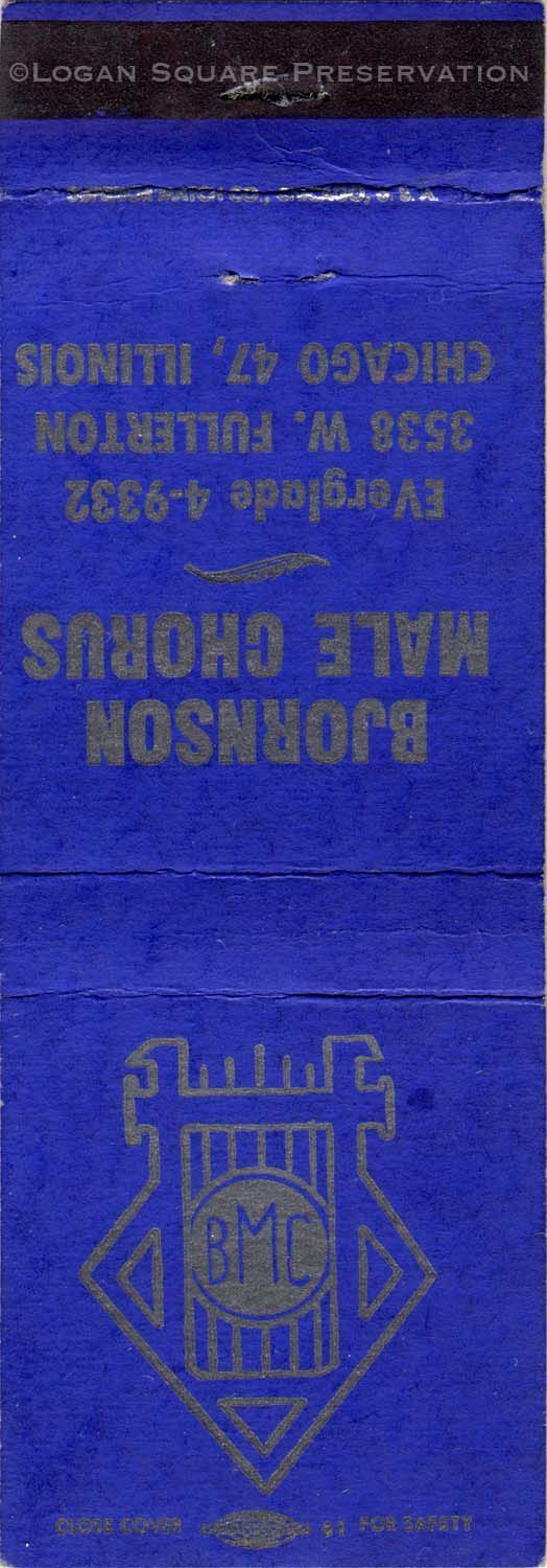 1.5" matchbook printed in silver ink on blue with logo of Bjornson Male Chorus on front, circa 1950sPublication Details