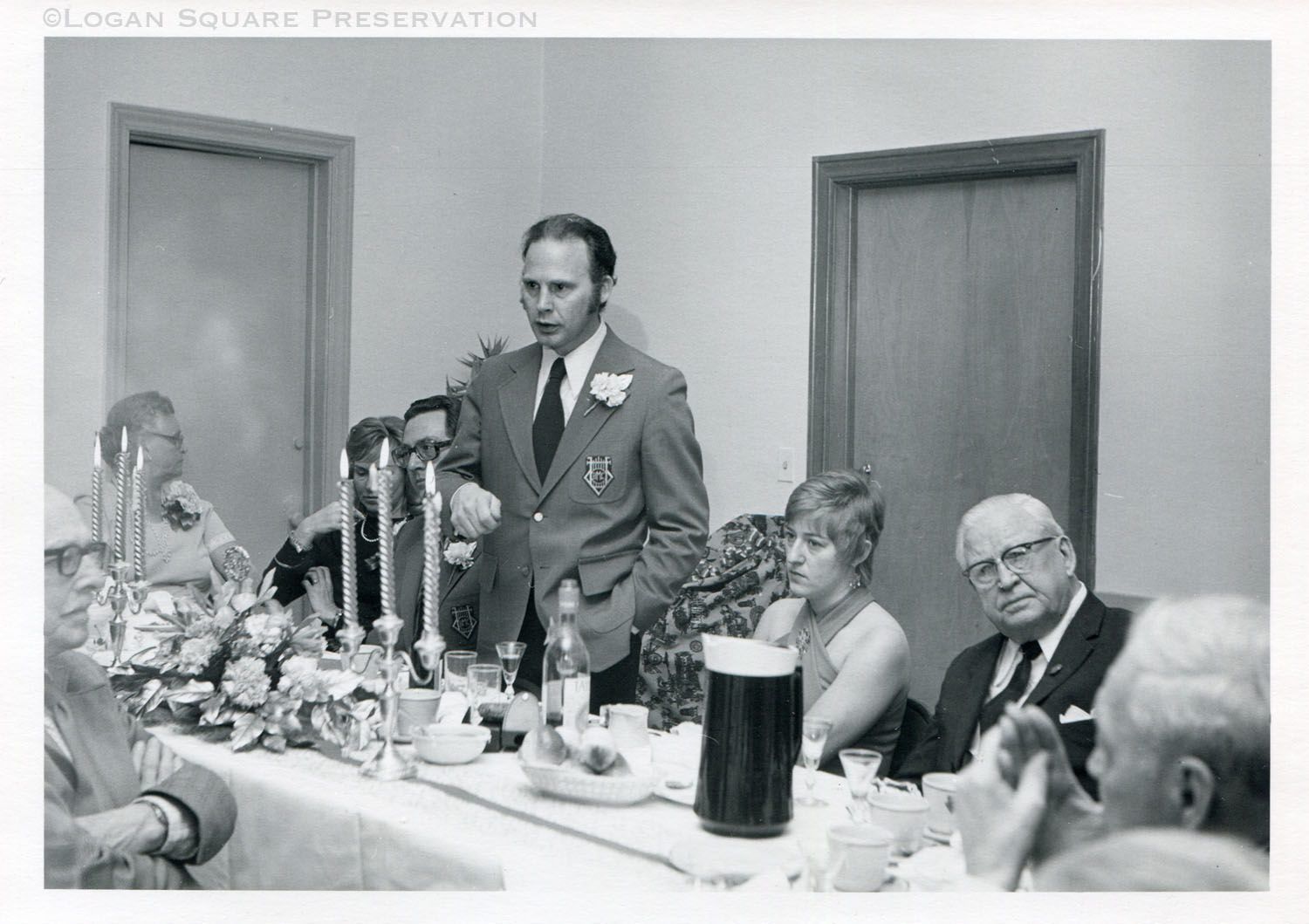 Photograph of John Lee standing and speaking behind candelabra after dinner at Bjornson club house, circa 1970sPhotograph Details