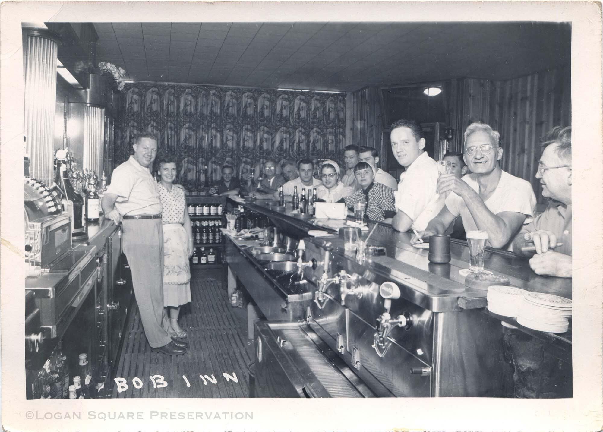5x7 promotional photo of Bob Inn patrons sitting at bar with drinks and Harold Hanson and Jo Hanson standing behind, circa 1950sPhotograph Details