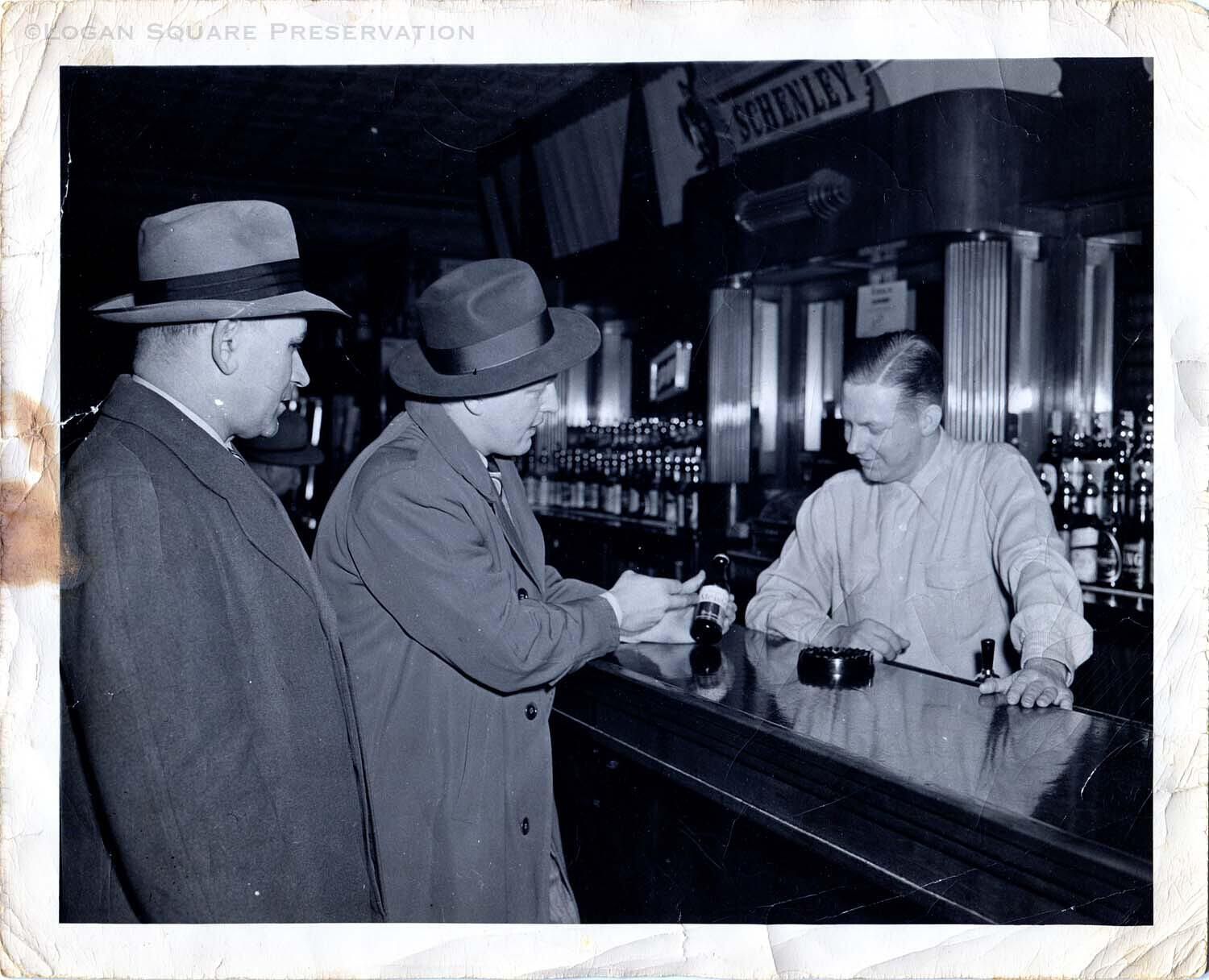 Promotional photo of two beer salesmen pitching bartender Harold Hanson with sample bottle of Meister Brau beer, circa 1940sPhotograph Details