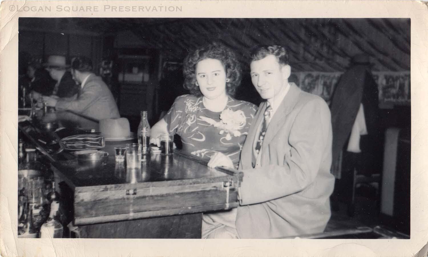 Snapshot photo of couple sitting at end of bar. Ceiling of room decorated with streamers for Christmas, circa 1950sPhotograph Details