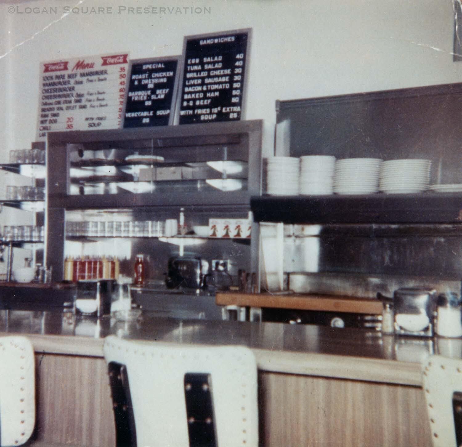 Enlarged reprint of snapshot photo of counter, grill, storage cases and menu board at Bob Inn Grill, circa 1970sPhotograph Details