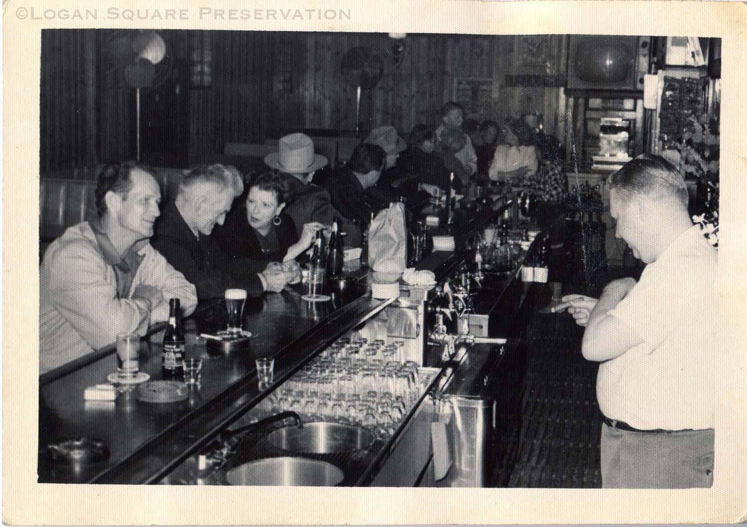 Snapshot photo of patrons at crowded bar talking to bartender Harold Hanson smoking cigar. Dated on back 9/1/1955Photograph Details