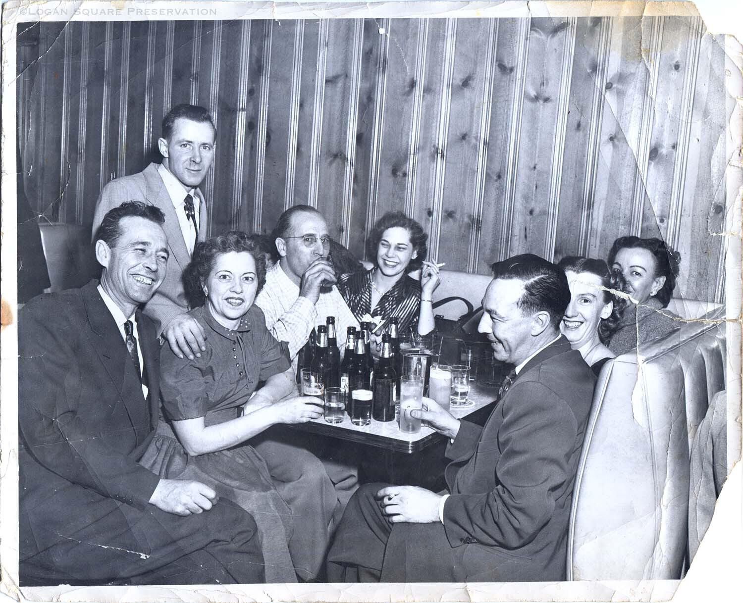 8x10 photograph of smiling bar customers at booth table crowded with beer bottles, circa 1950sPhotograph Details