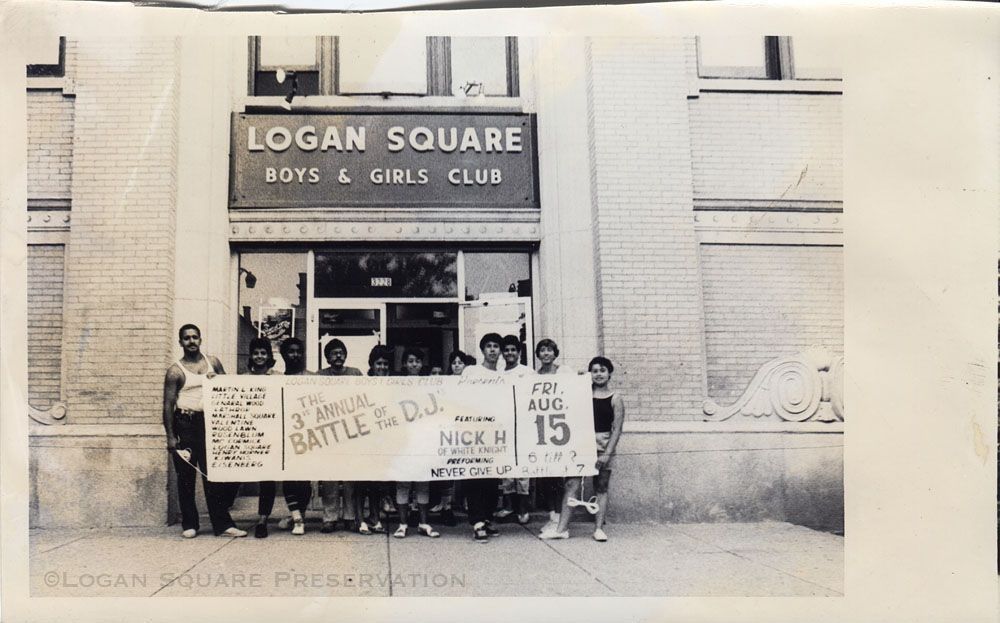 News photo of group of children and adults in front of entrance to Boys & Girls Club holding painted banner for The 3rd Annual Battle of the D.J. featuring Nick H. of White Knight performing "Never Give Up" on Fri, Aug 15, circa 1970sPhotograph Details