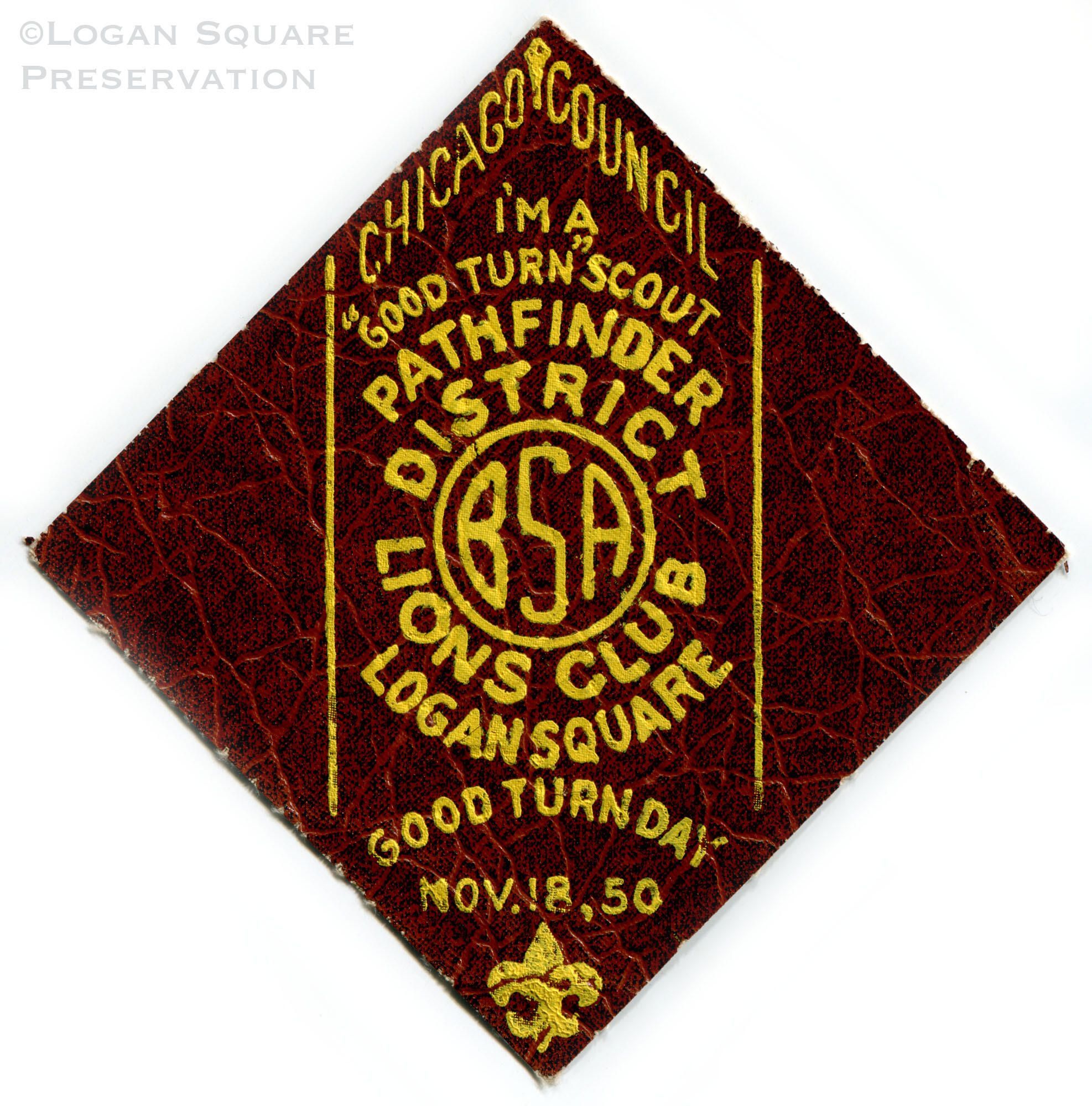 3" square fake leather patch printed in yellow ink for Nov 18, 1950 Good Turn Day from Logan Square Pathfinder District Lions Club BSAInscription/Signature/Marks