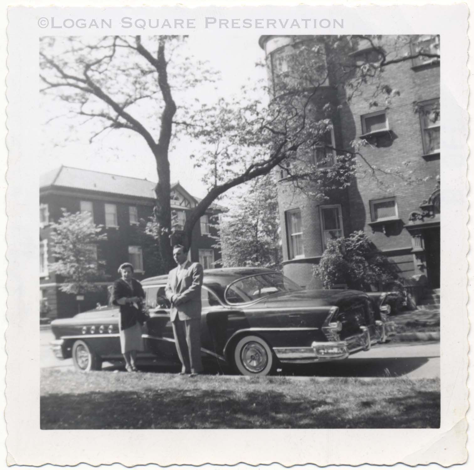 Snapshot photo of man and woman standing next to 1955 Buick Roadmaster sedan parked on Logan Boulevard in front of 2956 W. Logan Blvd, circa late 1950sPhotograph Details