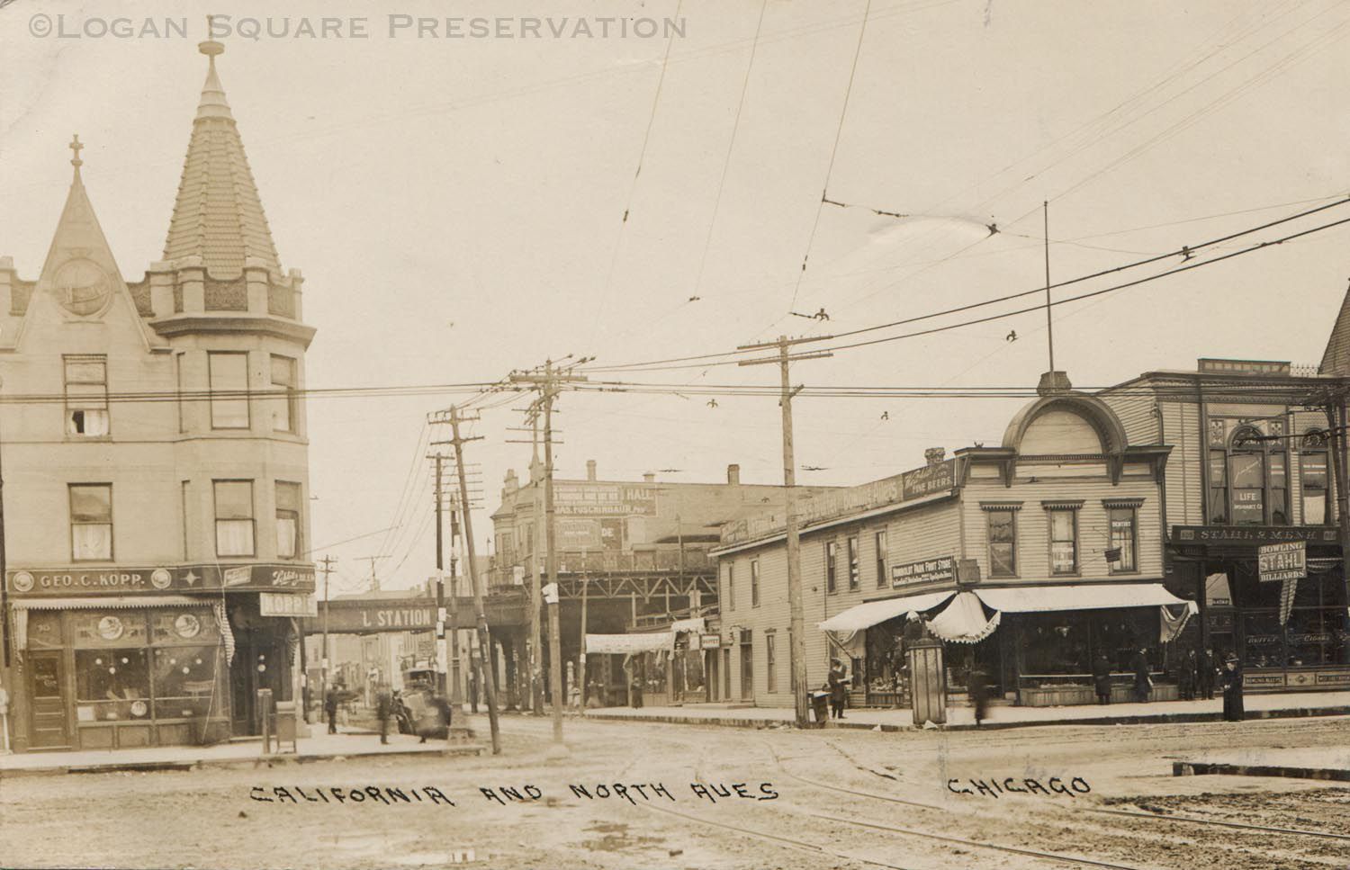 Real photo postcard looking north at California and North Ave intersection, with George Kopp Schlitz tied-house saloon, Humboldt Park Paint Store and Stahl billiard hall in foreground, Metropolitan Elevated station in distance, circa 1908Subject