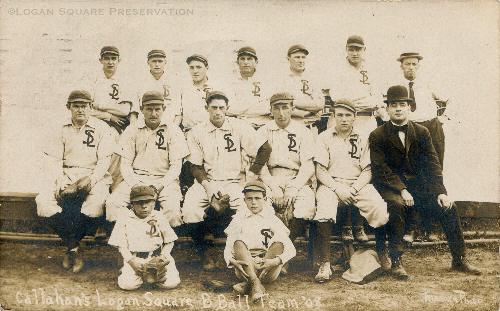 Real-photo postcard photo of 1908 Logan Squares baseball team with manager and bat boysSubject Person/Organization