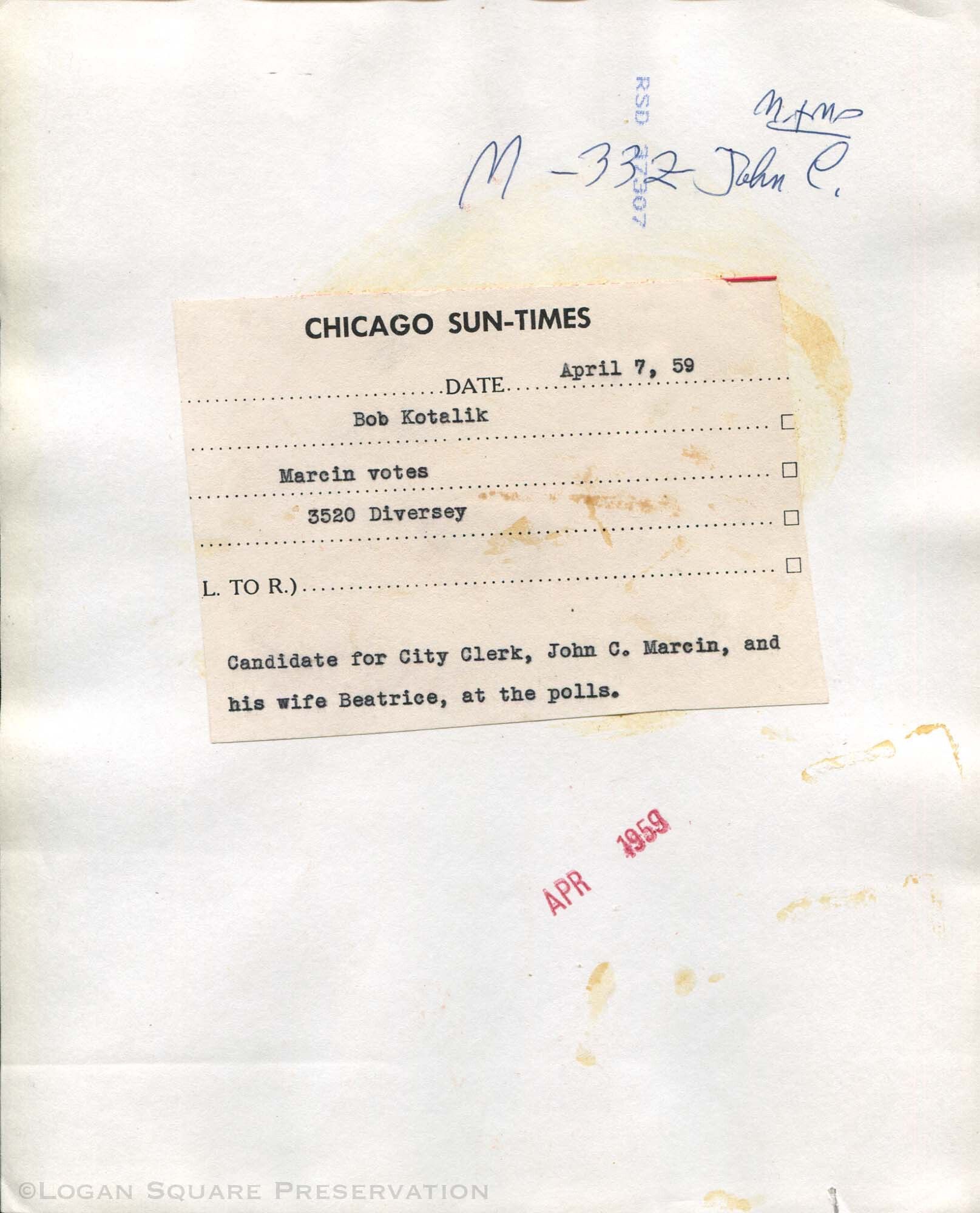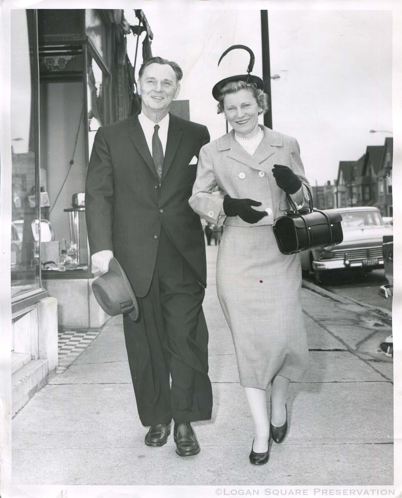 News photo portrait of city clerk John C. Marcin and his wife Beatrice walking past Diversey Ave storefronts after voting in Feb 1959 electionPhotograph Details