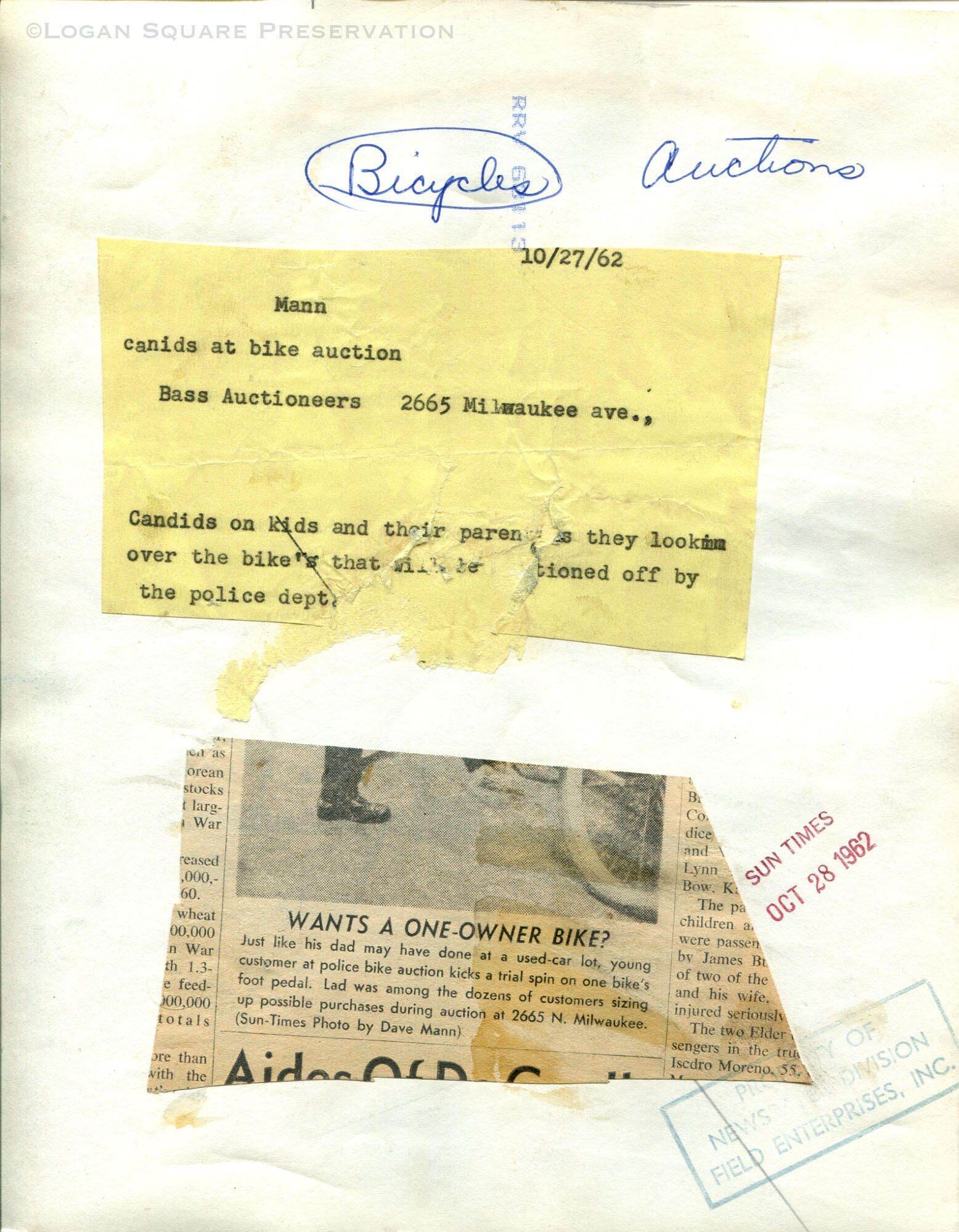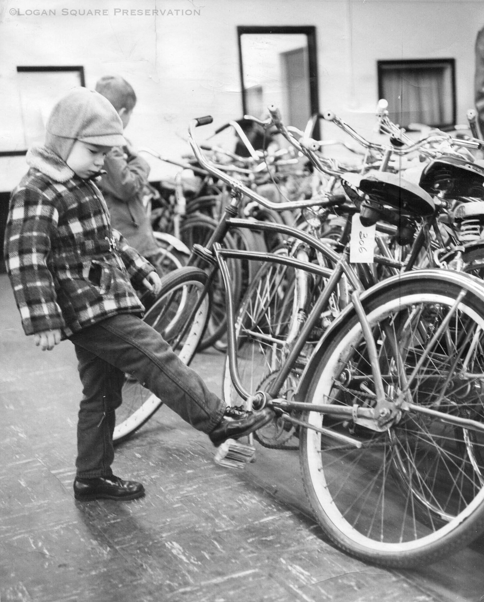 News photo image of boy kicking pedals of bikes at police auction of unclaimed bicycles at Bass Auctioneers, 1962Photograph Details