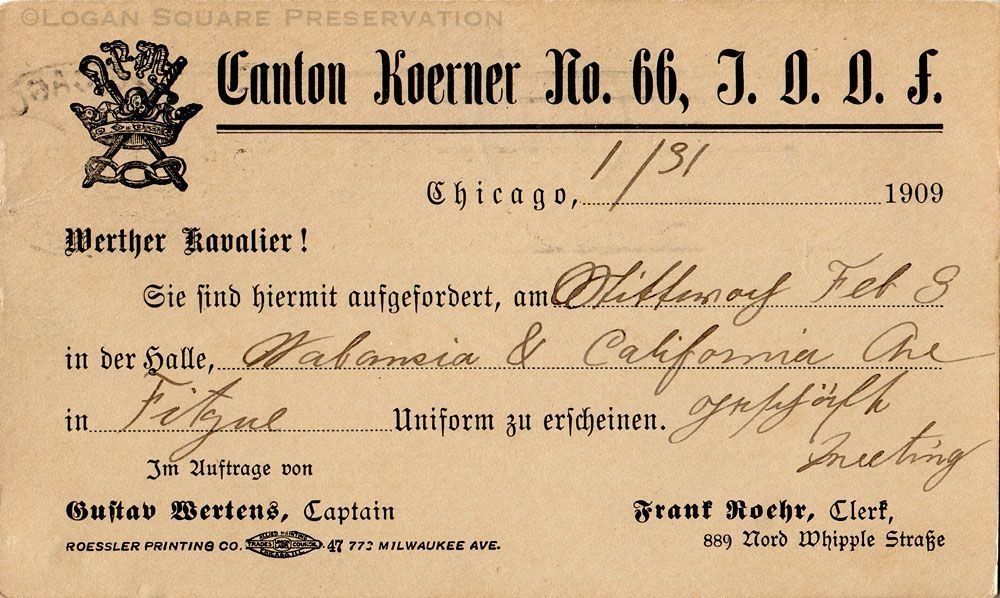 Printed postcard with hand-written information notifying members of upcoming Odd Fellows meeting at Wabansia & California with proper uniform, 1909Subject Person/Organization