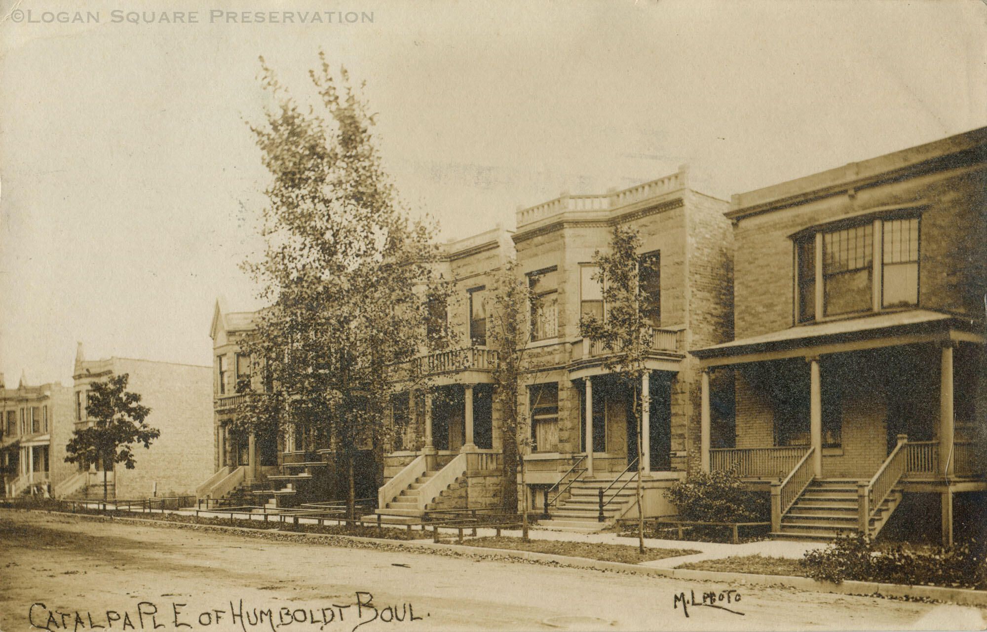 Real-photo postcard view looking east at greystone 2-flats on 2400 block of Albany Ave (formerly Catalpa Place), circa 1908Subject