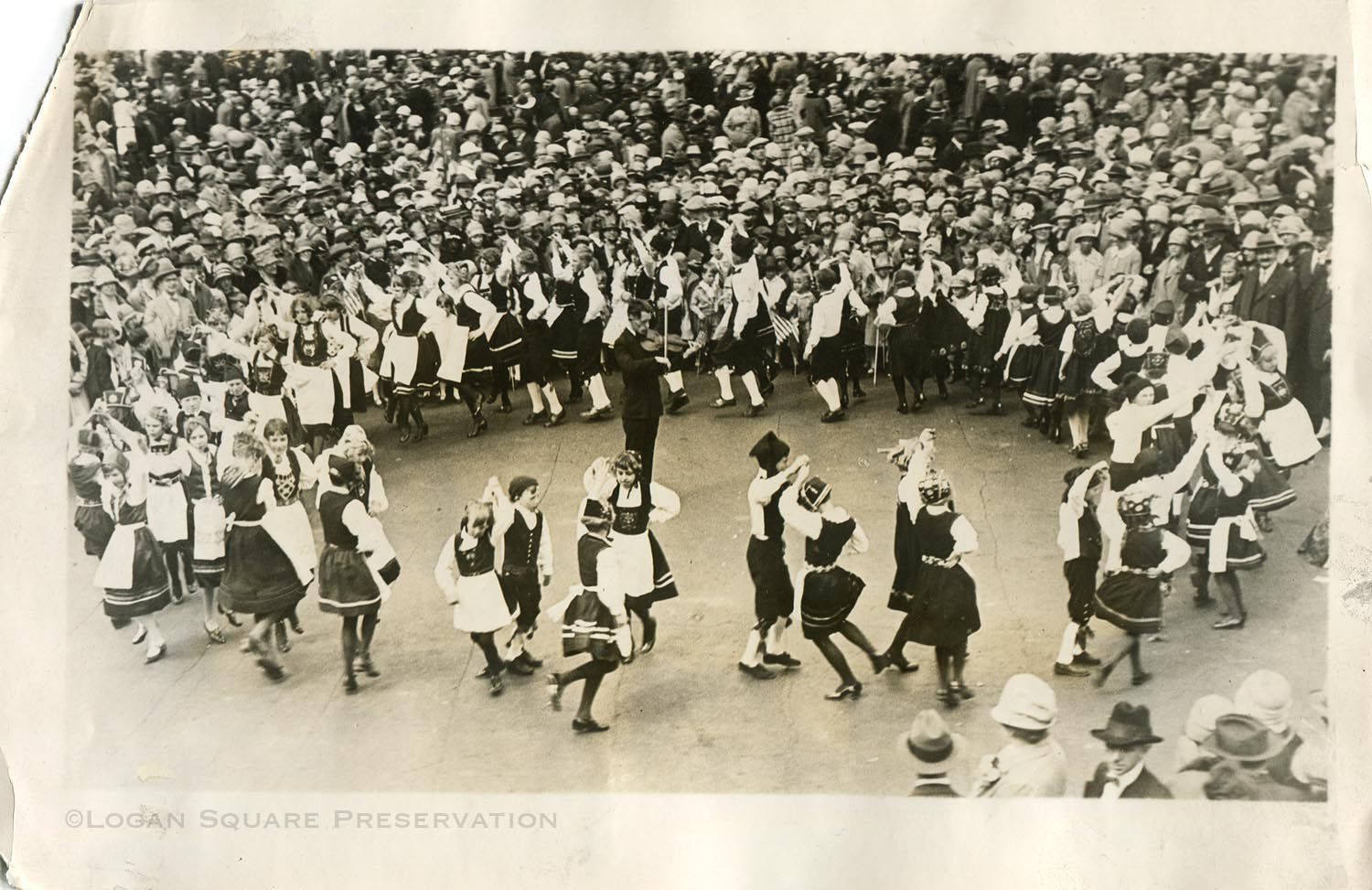 News photo view looking down on circle of costumed children performing a folk dance in front of a crowd during Syttende Mai Norwegian-American festival at Humboldt Park, May 16, 1931Photograph Details