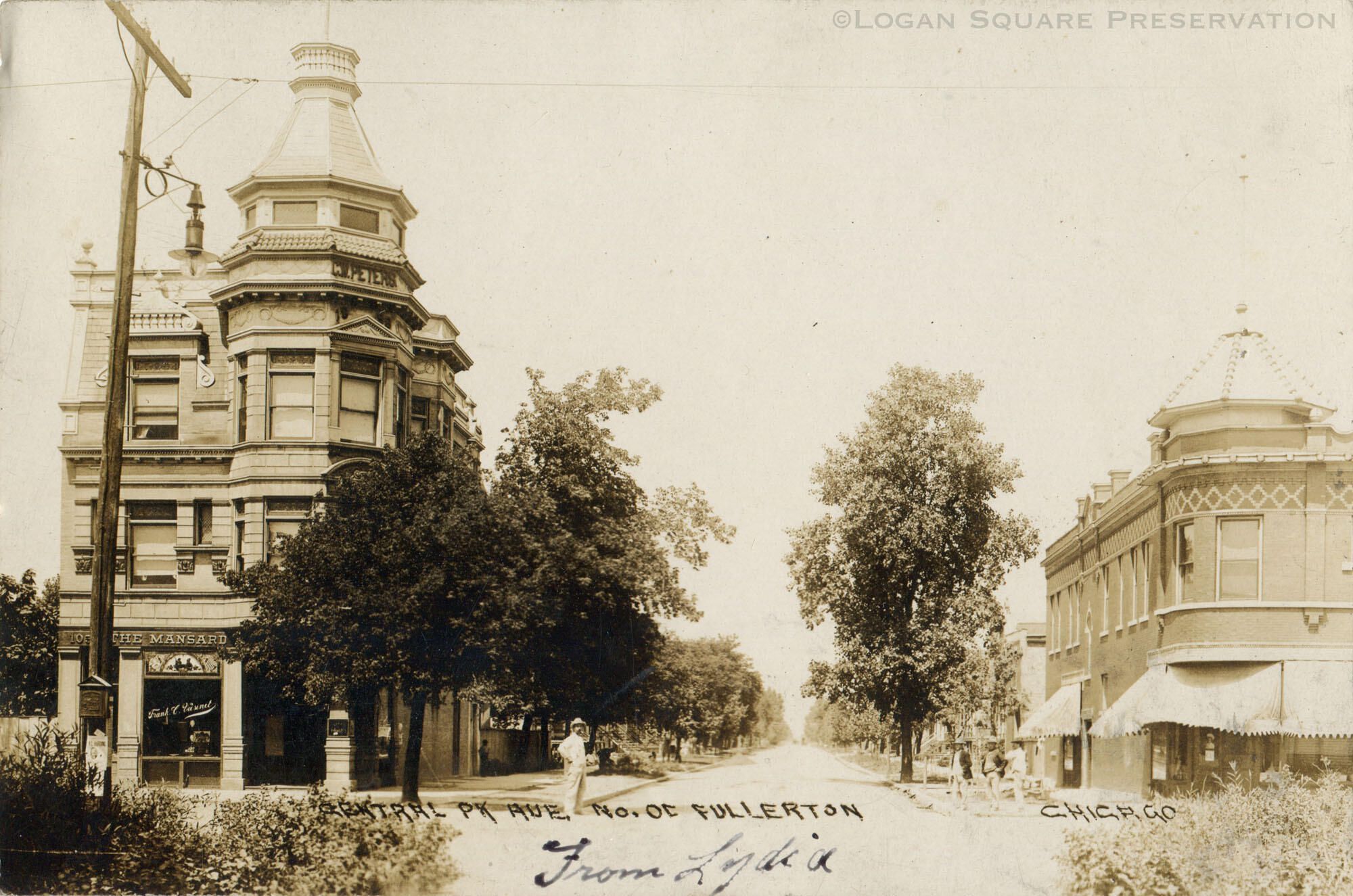 Real-photo postcard view looking north at elaborate Charles W. Peters tower building on northwest corner with Frank C Voisant saloon and storefront apartment building on northeast corner of Central Park and Fullerton Aves, circa 1909. Four men with mustaches standing on both corners looking at photographer. Peters building possibly later moved to 3618 W. Wrightwood.Subject Place